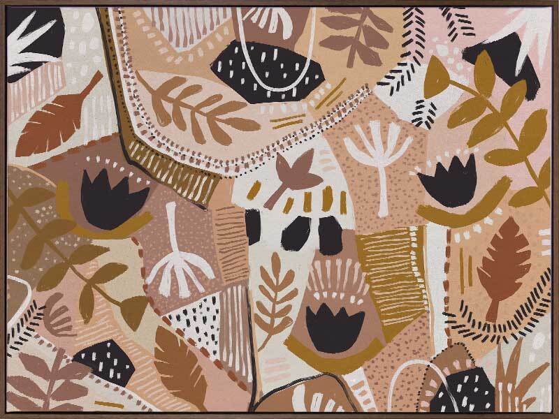 Patchwork Proteas Canvas Art Print - This warm, boho inspired abstract artwork layers organic colours, botanical shapes, and interesting textures, creating a patchwork style piece. The colour palette is grounded and earthy, featuring an array of brown, beige, mustard and cream.