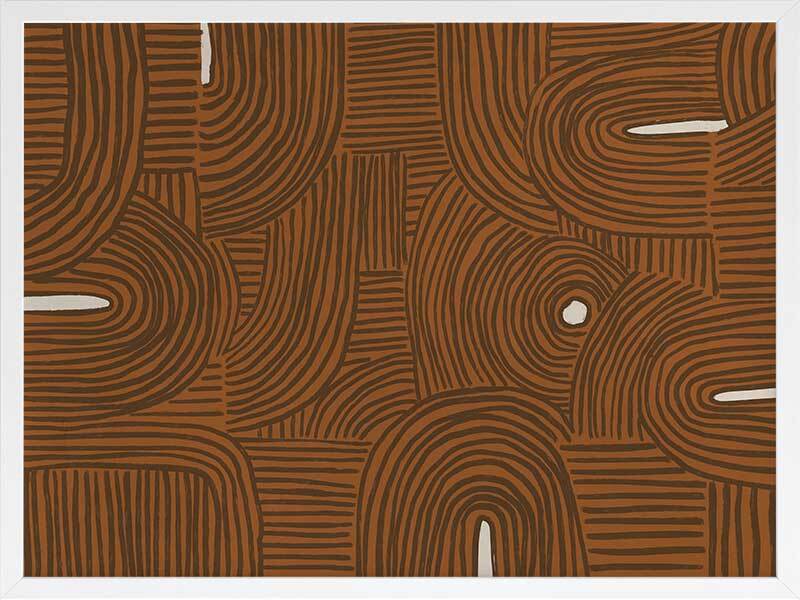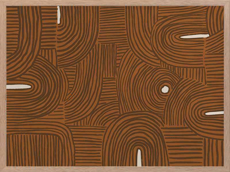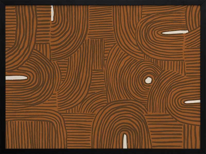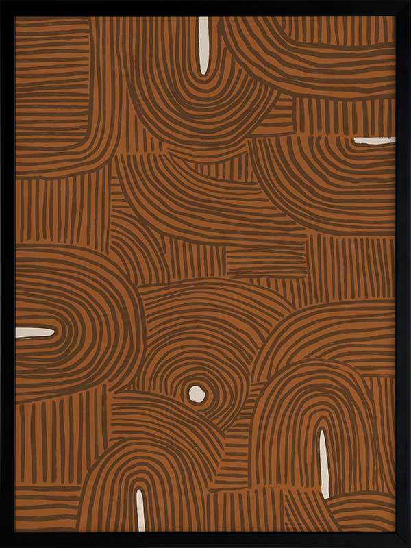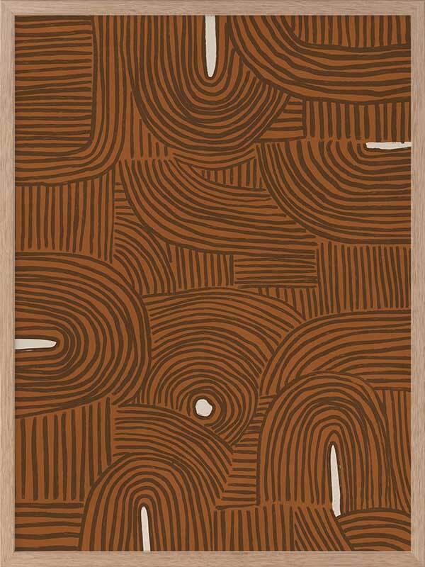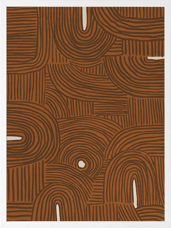 Pathways Framed Art Print - All of us are on our own path, but many of us meet those we love along the way. A mesmerizing abstract piece, this artwork features detailed linework, compiled to form a random pattern, no two lines the same to bring a relaxed look and feel. Palette includes a terracotta brown backdrop, with brown lines and touches of creamy white.