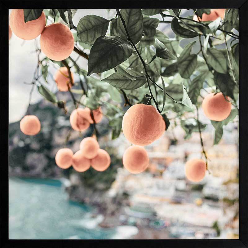 Peachy Dreams Framed Art Print - Peaches swing from their branches, soaking the warm Italian sun in this playful photographic wall art. Featuring a soft palette of creamy orange, green, and neutrals, this piece will have you dreaming of European travels.