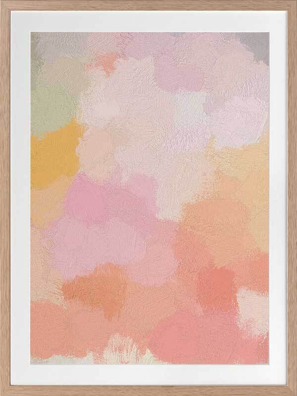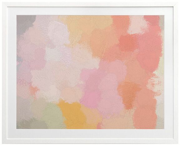 Peachy Keen Framed Print: A soft and stunning abstract piece, with textured paint strokes in a bright and bubbly pastel colour palette. 2017 SPRING/SUMMER COLLECTION: RHAPSODY