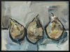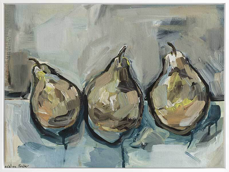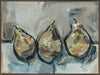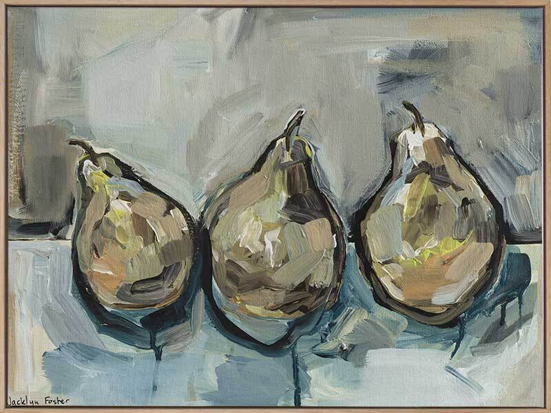 Pears Canvas Art Print - Bring some life to your space with this abstract-style still life artwork, featuring three juicy pears lined up in a row. Despite its simple composition, the wide, visible brush strokes and unblended colours give it a playful feel, creating movement that elevates any space. The palette includes muted grey, brown, blue, and pops of yellow, making it the perfect fit for any interior style.