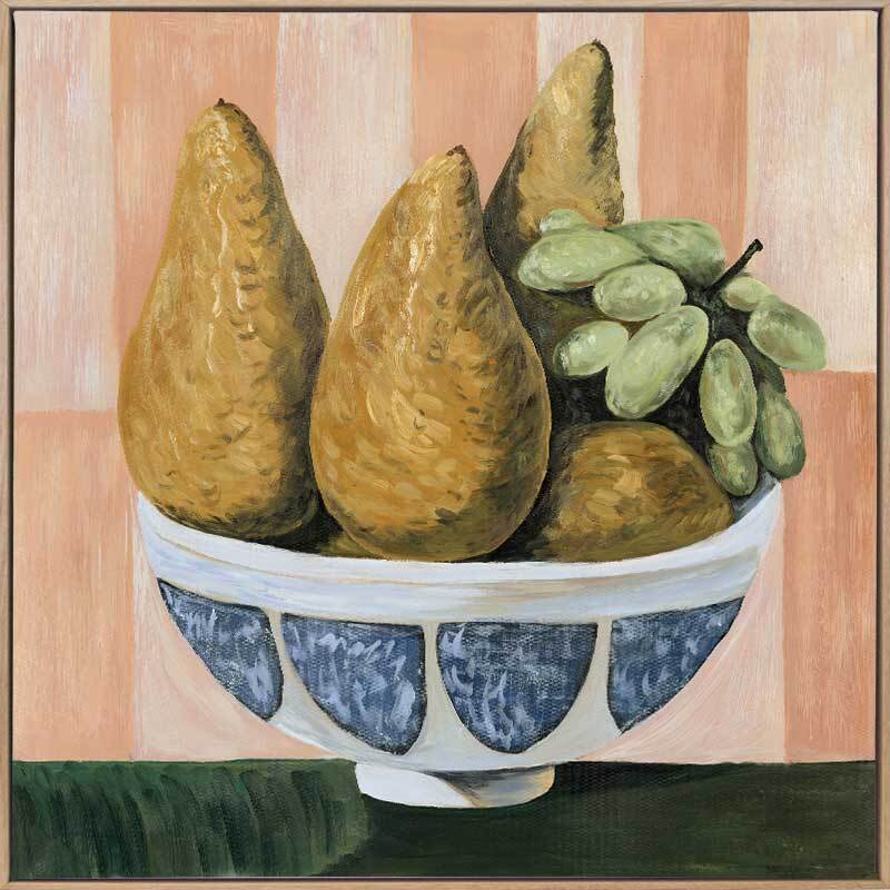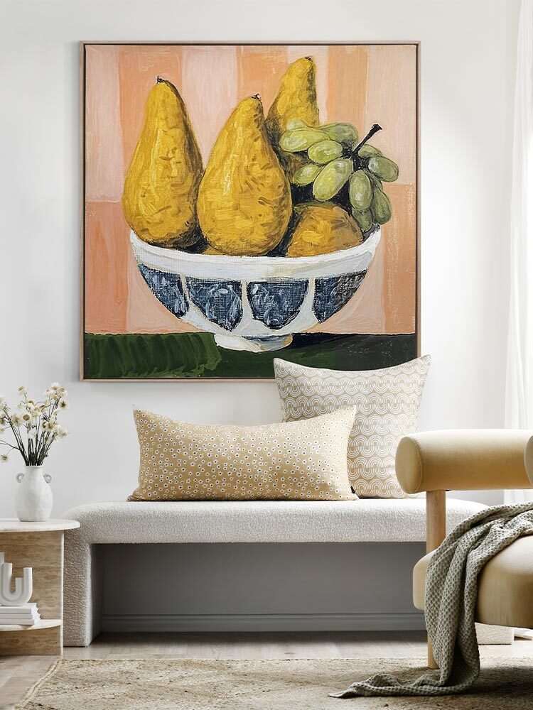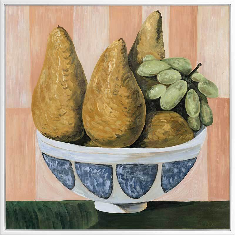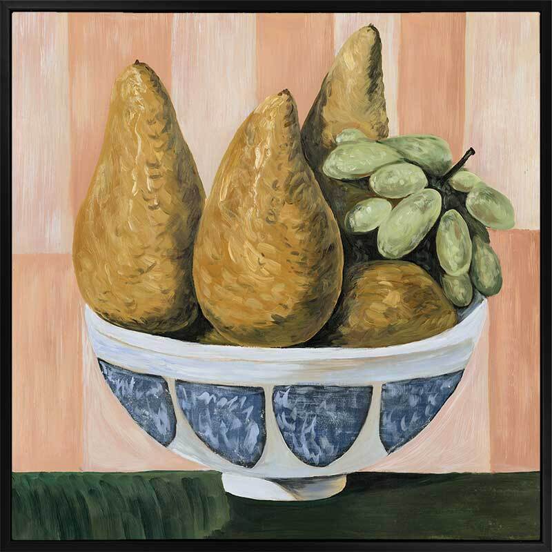 Pears & Grapes Canvas Art Print - Your newest kitchen wall art is here, and it's an abundance of fresh, juicy pears and grapes ready to bring a calming, yet vibrant feel to the space. Featuring a painterly style and touch of realism, this Mexican-inspired still life artwork includes golden yellow, soft green, pink, blue, and white shades.