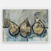 Pears Unframed Art Print - Bring some life to your space with this abstract-style still life artwork, featuring three juicy pears lined up in a row. Despite its simple composition, the wide, visible brush strokes and unblended colours give it a playful feel, creating movement that elevates any space. The palette includes muted grey, brown, blue, and pops of yellow, making it the perfect fit for any interior style.