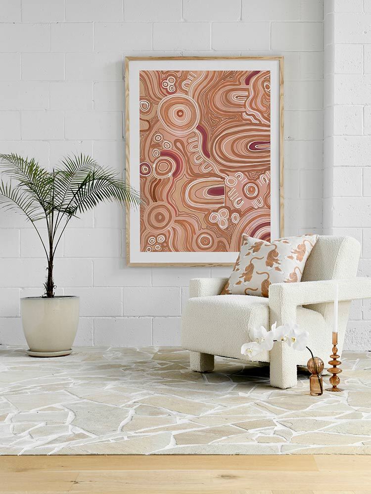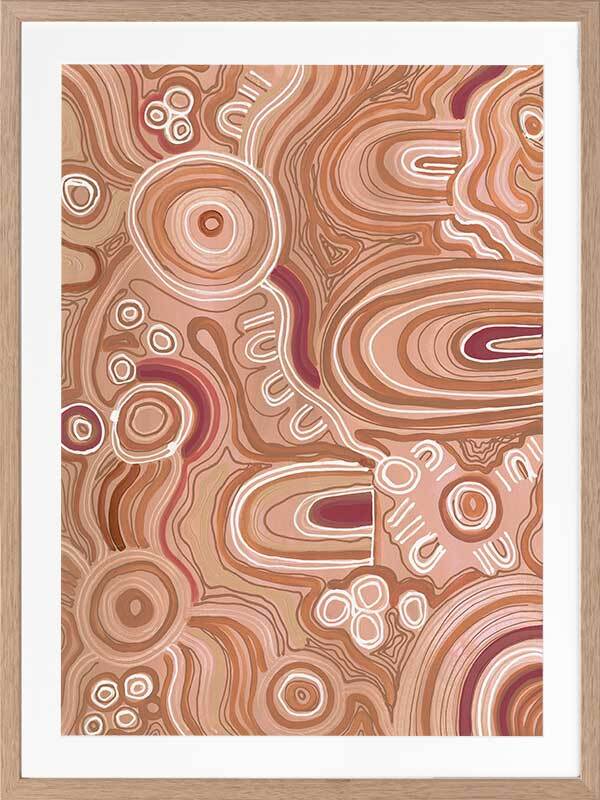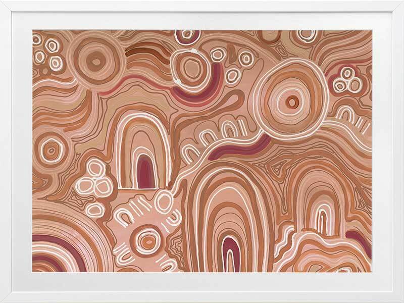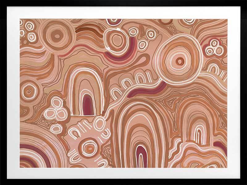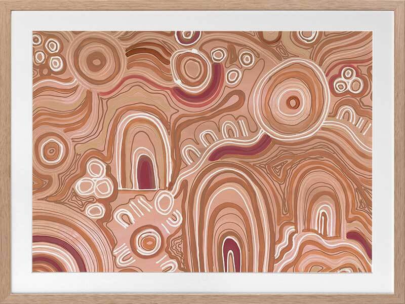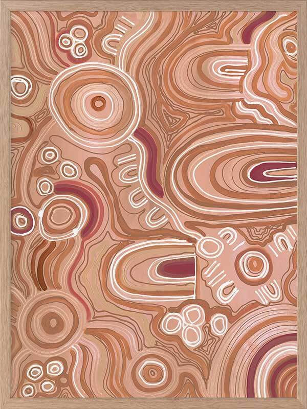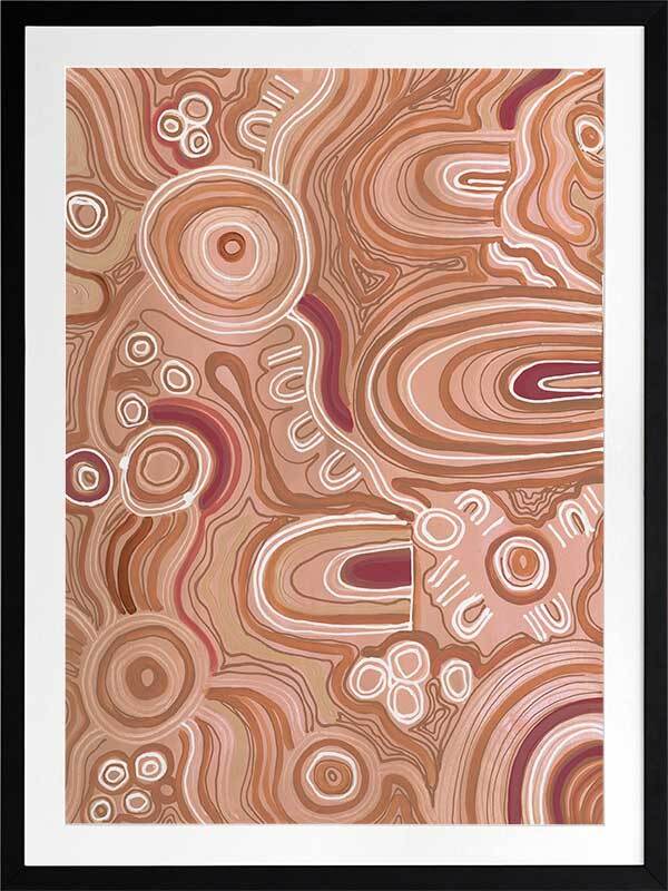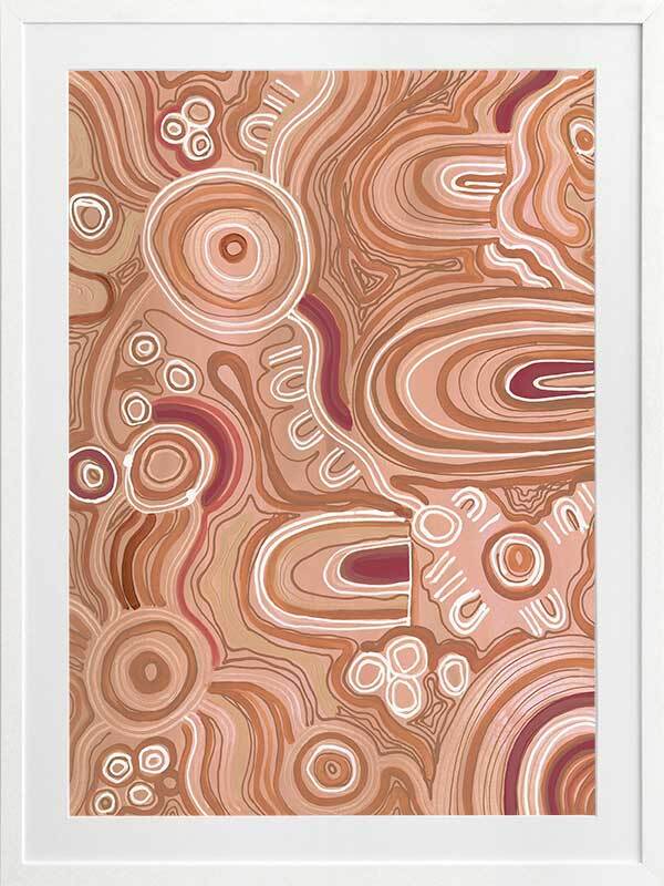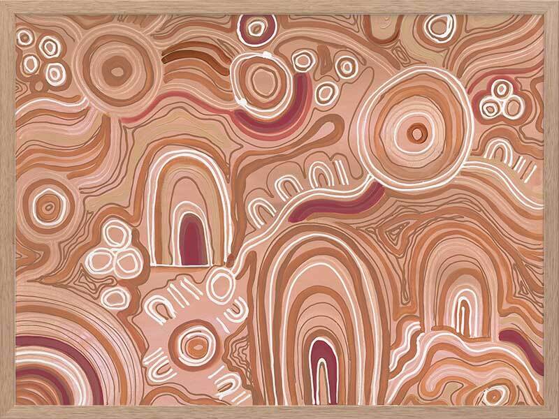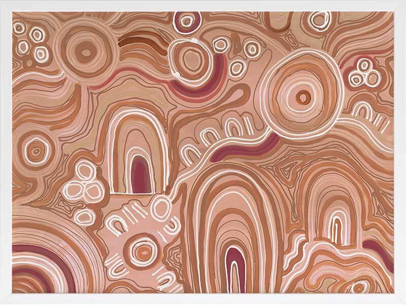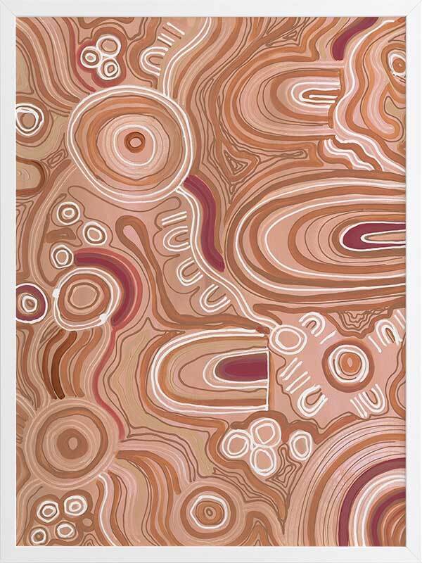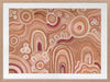 People, Place, Community Framed Art Print - This Indigenous Aboriginal artwork piece features a spectrum of curves, circles and small lines, all moving together in harmony, yet in their own individual way. Ideal for most interior design styles with its simple colour palette of tan and beige, with pops of ruby red.