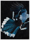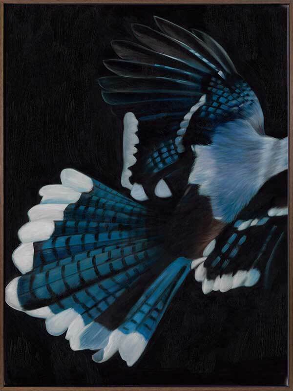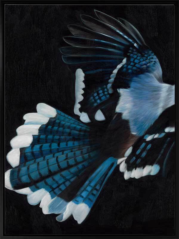 Perch Canvas Art Print: A beautifully detailed oil painting of a Blue Jays outstretched wings against a black background. 2018 AUTUMN/WINTER COLLECTION: CONTINUUM