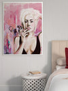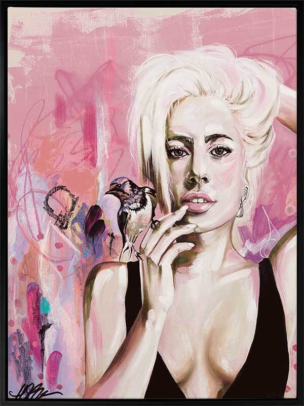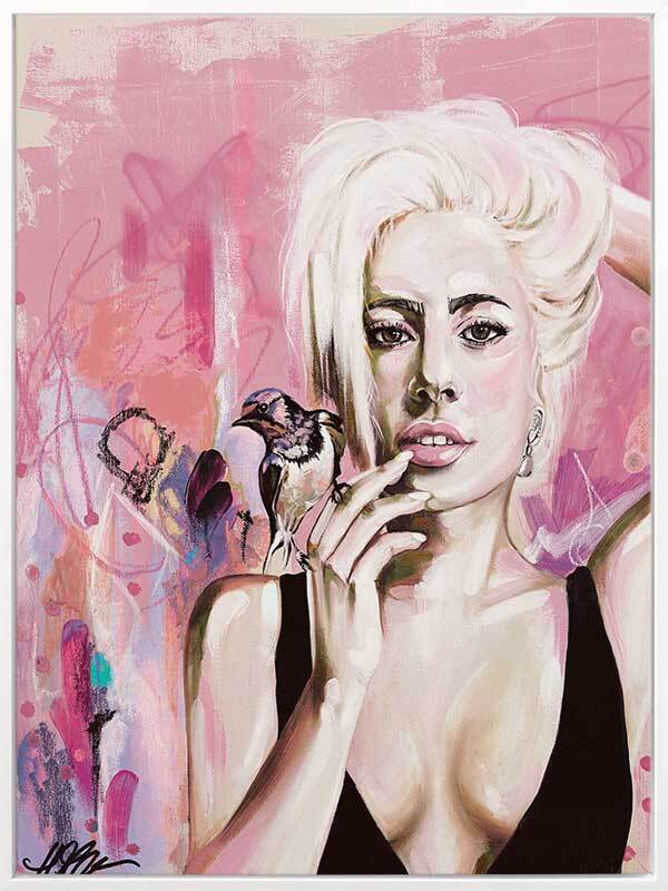 Perfect Illusion Canvas Art Print - An ode to Lady Gaga's power and creativity, this piece features graphic brush strokes, dots, and lines, with Gaga in the foreground, a songbird perched atop her hand. The lively pink, blue and yellow palette evokes her energetic, fiery spirit.