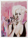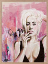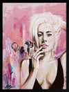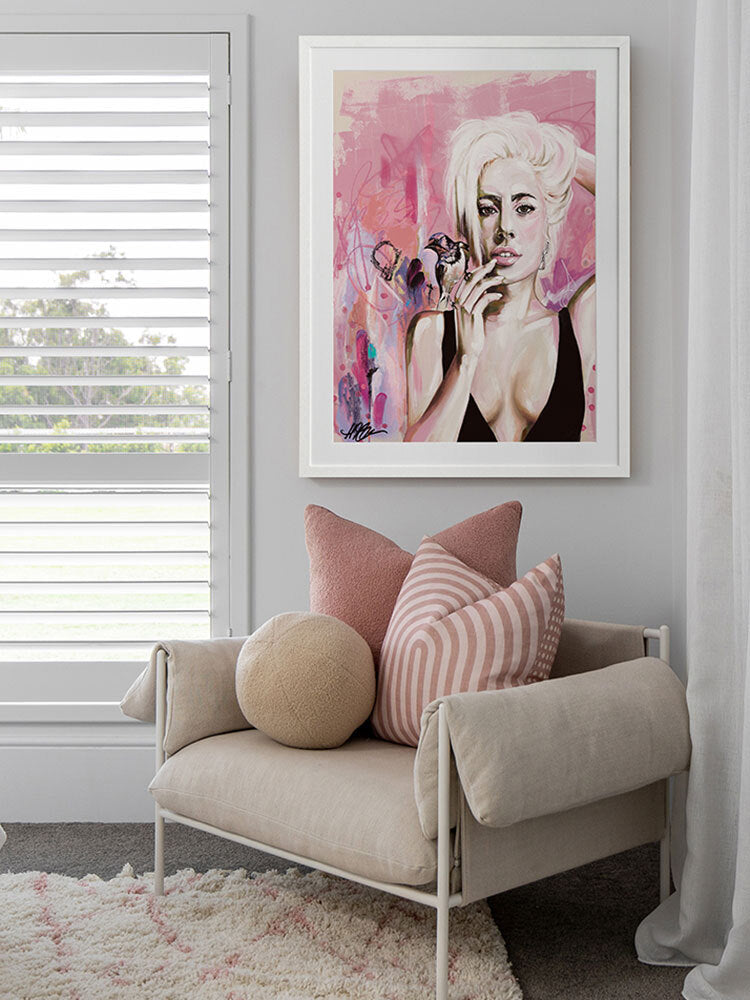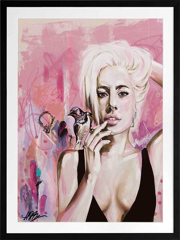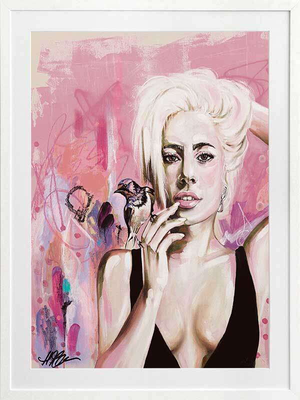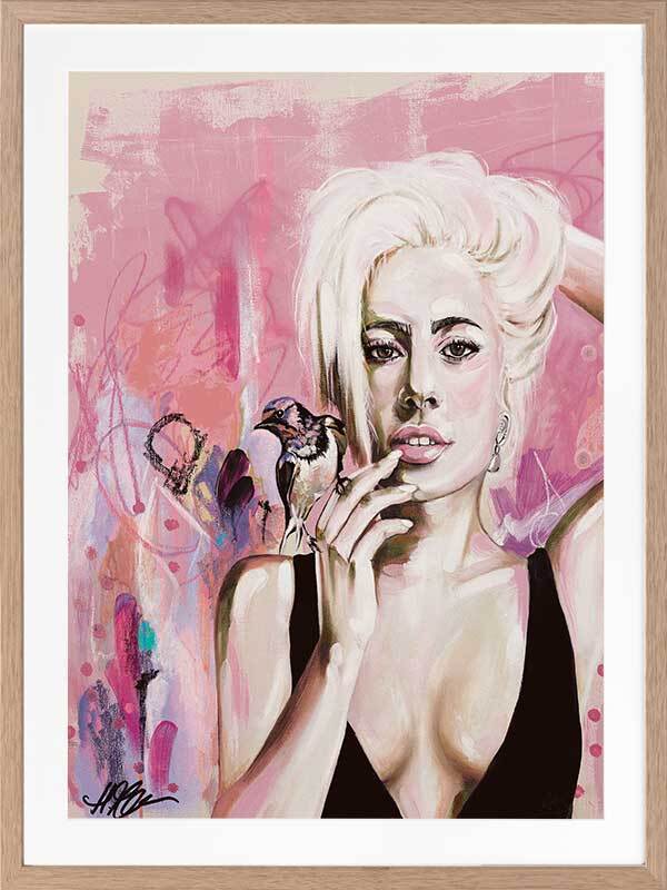 Perfect Illusion Framed Art Print - An ode to Lady Gaga's power and creativity, this piece features graphic brush strokes, dots, and lines, with Gaga in the foreground, a songbird perched atop her hand. The lively pink, blue and yellow palette evokes her energetic, fiery spirit.