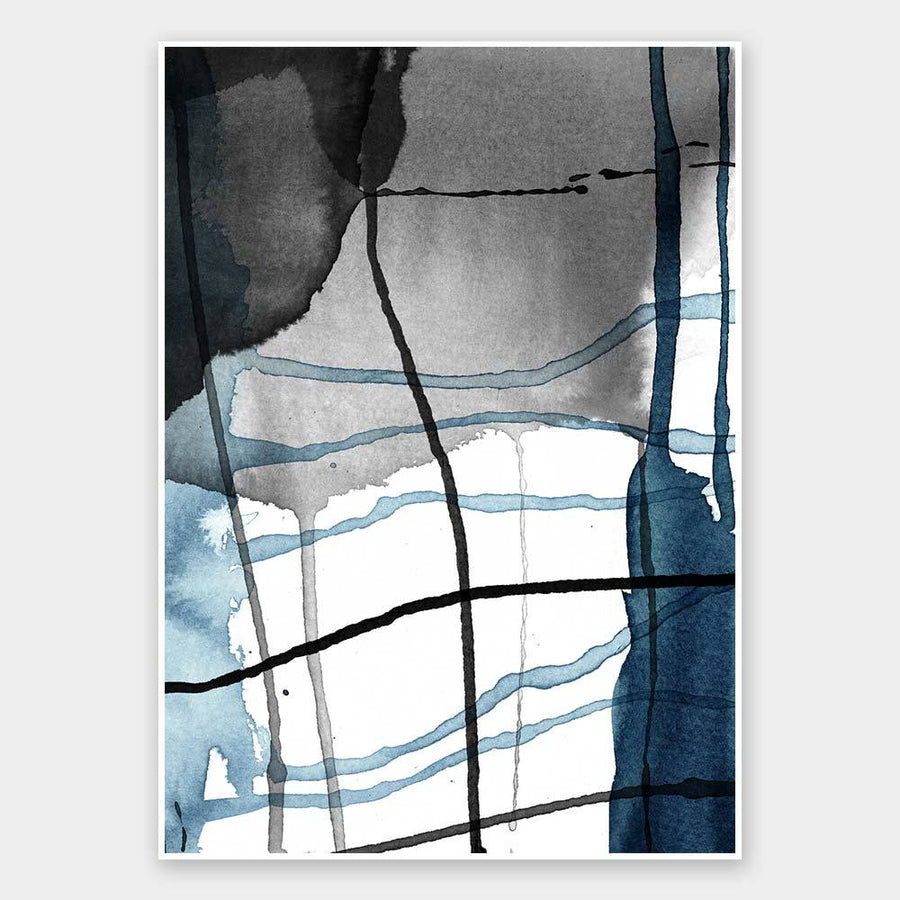 Feint Fine Art Print: A moody abstract artwork featuring a winding, textured blue paint stroke on a grey background. Pairs with River Wild. 2018 AUTUMN/WINTER COLLECTION: CONTINUUM
