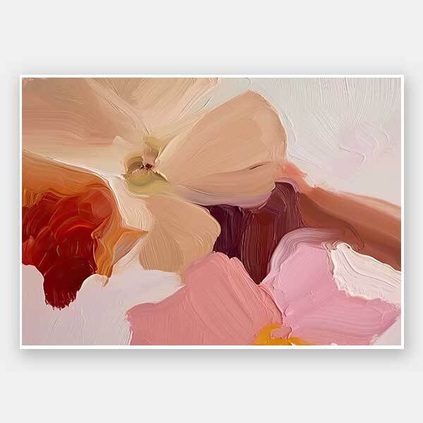 Petals I Unframed Art Print - Indulge in the gentle feel of petals as you immerse yourself in the embracing world of the Petals collection. This abstract floral painting offers a refreshing perspective on traditional pink still life artworks, showcasing visible brushstrokes, subtle blending, and a minimalist composition. With its delicate and whimsical charm, this piece transports you to a realm of beauty and simplicity. The soft palette of blush pink, beige, warm brown, red, yellow, and ivory further enhances its graceful allure. Get ready to embrace the tender beauty of Petals and let it bloom in your space. Pair with Petals II and III.