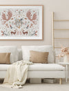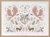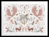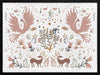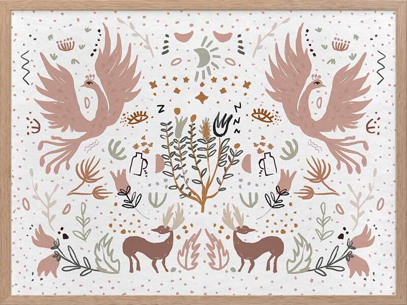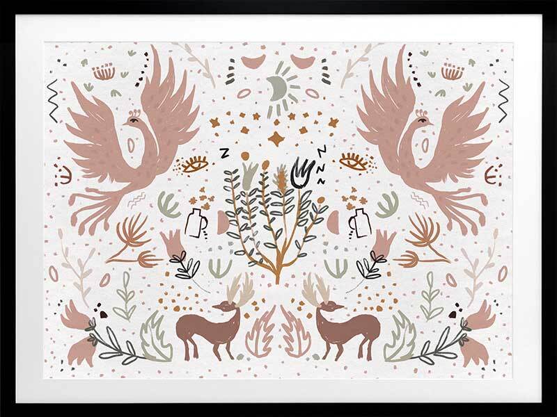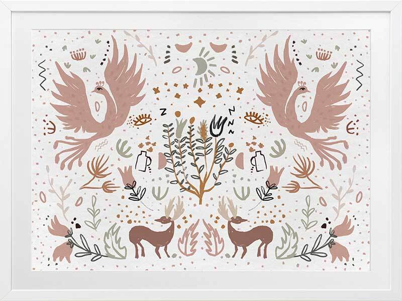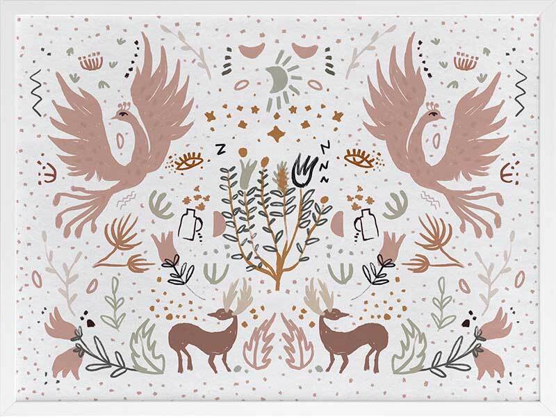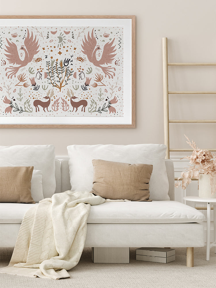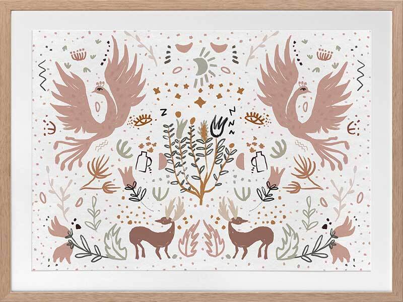 Phoenix Rising Framed Art Print - This soft, whimsical illustrated motif features an eclectic array of hand drawn elements, including phoenixes, deer and botanicals. The colour palette is light and bright, with blush, brown and sage against a textured white background.