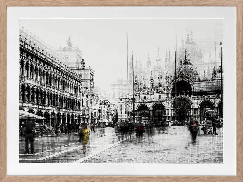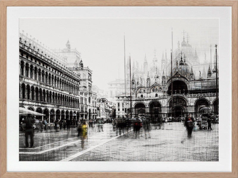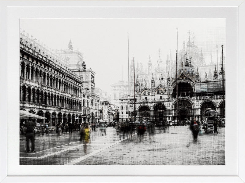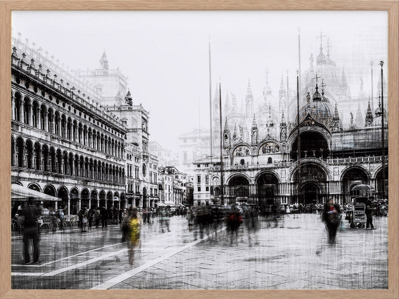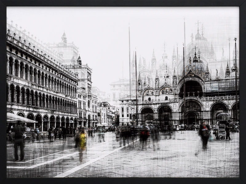 Piazza San Marco Framed Art Print - A blurred photograph of the Piazza San Marco in Venice crowded with pedestrians, and featuring heavy dark lines and contrast. THE CURATED SERIES A handpicked gallery of daringly quirky photographic pieces exploding with richness of colour and texture.