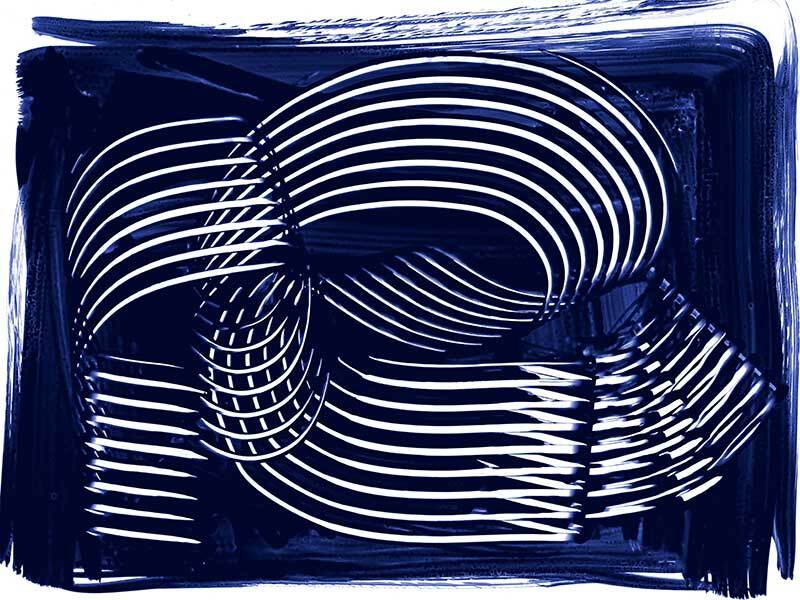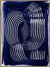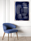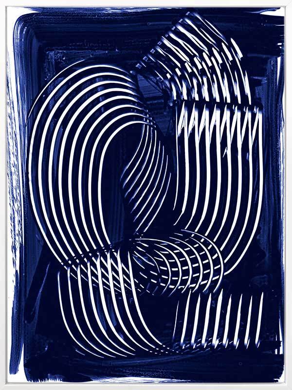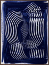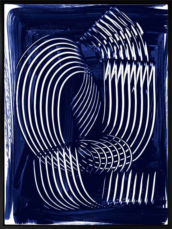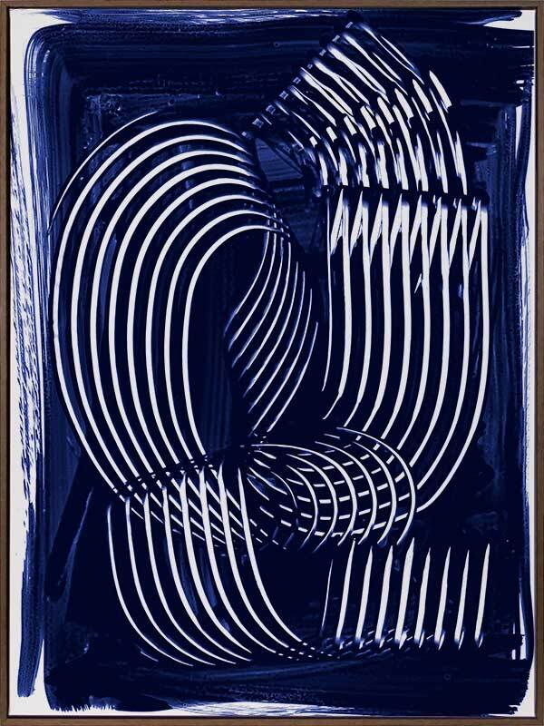 Pierre III Canvas Art Print - Textural, experimental and expressive, this simple abstract artwork uses paint strokes, curves and negative space to create an organic and mesmerising visual statement. The colour palette is bold and moody, featuring white lines against a deep indigo blue background. Artwork matches with Pierre I, II and IV.