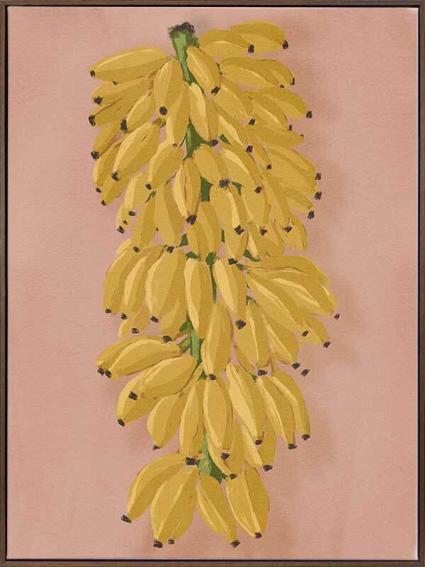 Platano I Pink Canvas Art Print - Evoking memories of sweet summer outings exploring fruit markets bursting with tropical food, this piece depicts a bunch of hanging bananas, ripe for the picking. A pink-toned clay backdrop lets the golden yellow tones in the foreground pop, with a hint of green to tie it together. The perfect pop of colour to energise any space.