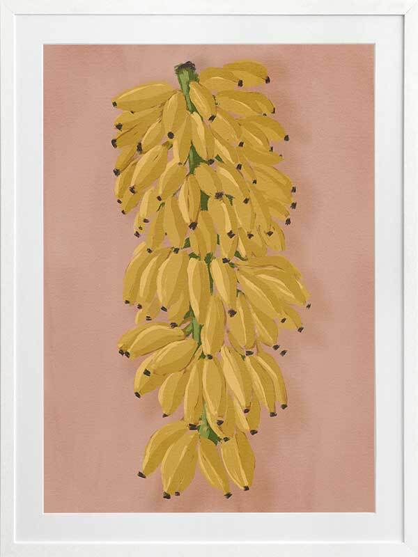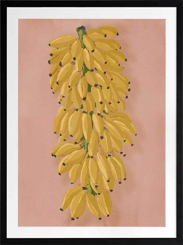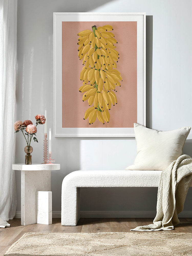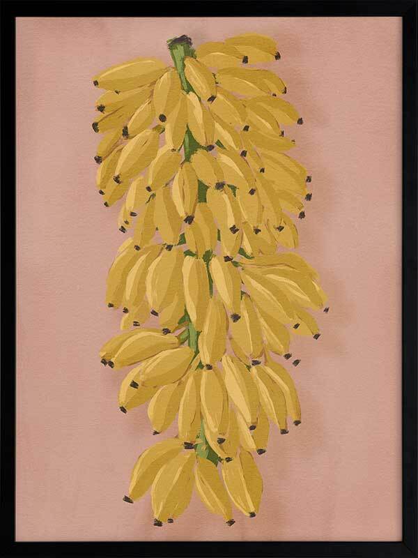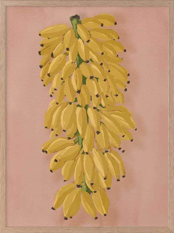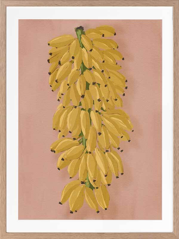 Platano I Pink Framed Art Print - Evoking memories of sweet summer outings exploring fruit markets bursting with tropical food, this piece depicts a bunch of hanging bananas, ripe for the picking. A pink-toned clay backdrop lets the golden yellow tones in the foreground pop, with a hint of green to tie it together. The perfect pop of colour to energise any space.