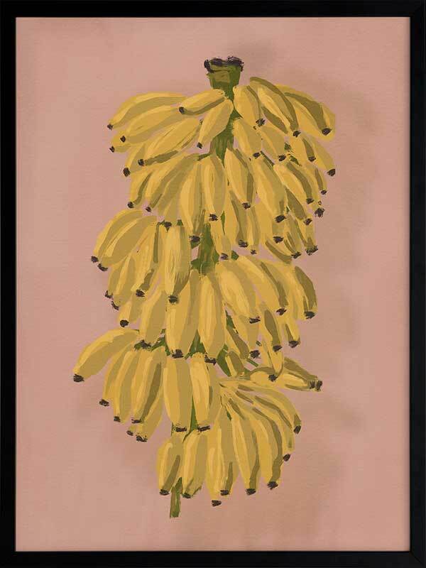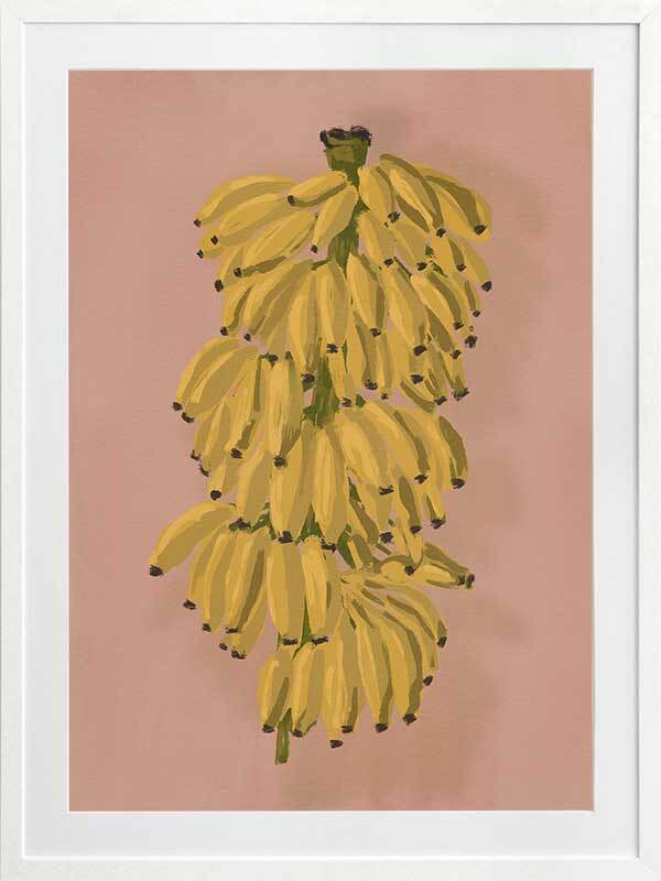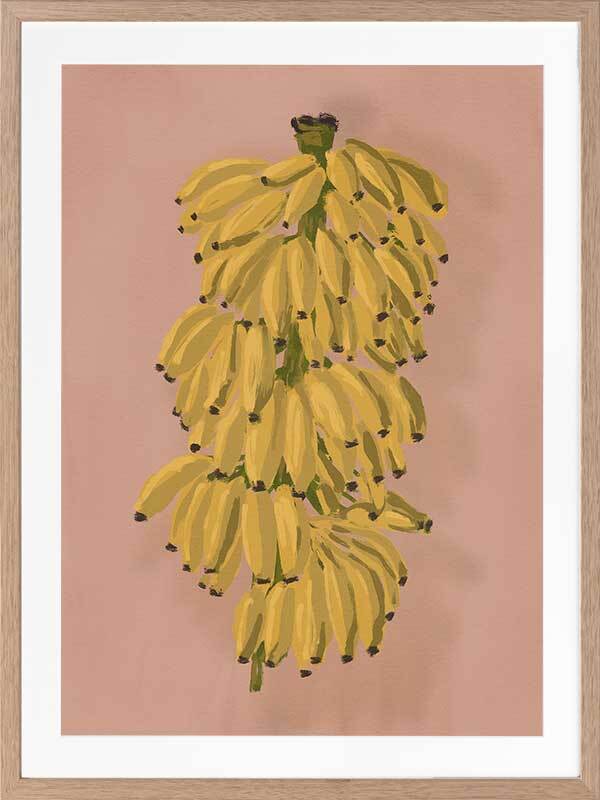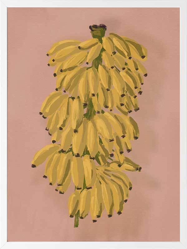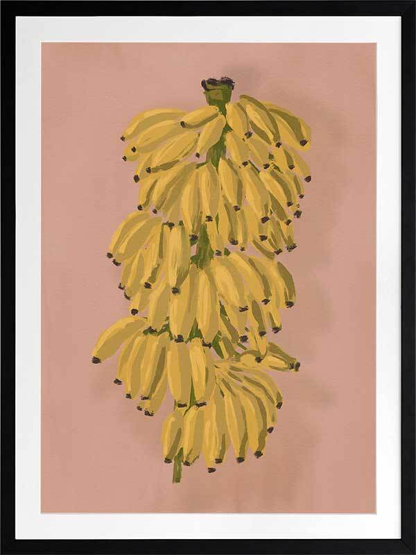 Platano II Pink Framed Art Print - Evoking memories of sweet summer outings exploring fruit markets bursting with tropical food, this piece depicts a bunch of hanging bananas, ripe for the picking. A pink-toned clay backdrop lets the golden yellow tones in the foreground pop, with a hint of green to tie it together. The perfect pop of colour to energise any space.