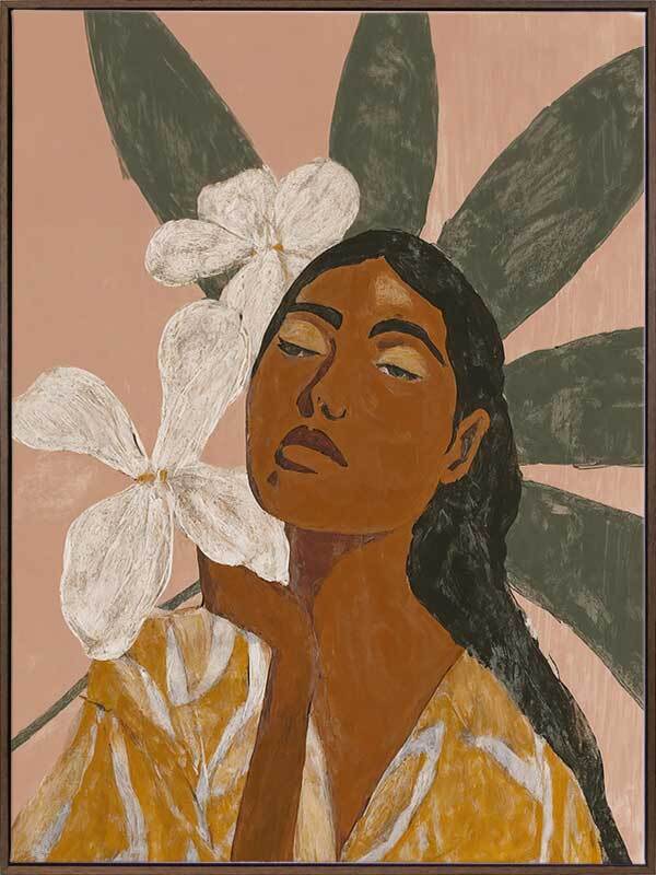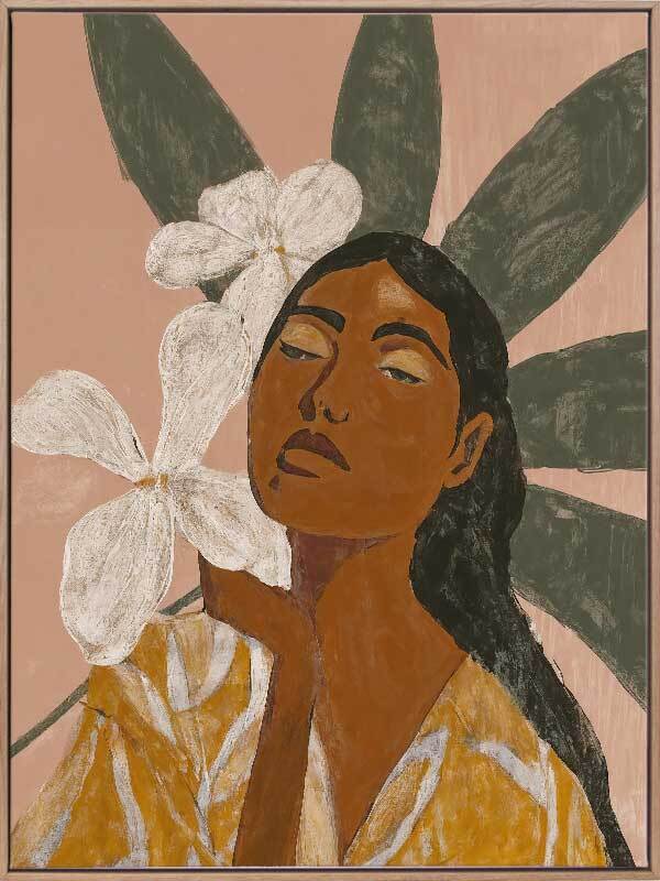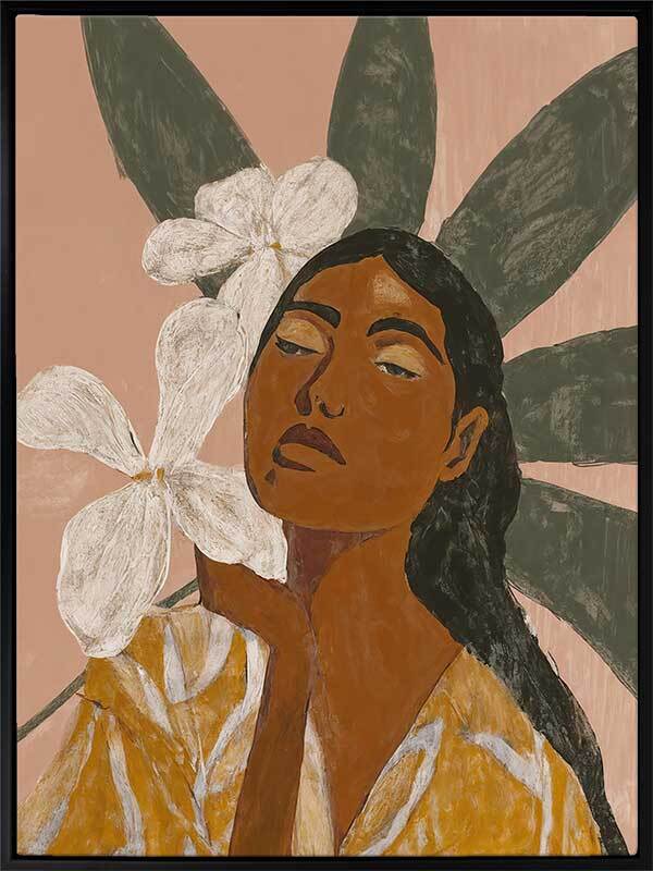 Pocah Canvas Art Print - Giving total Pocahontas vibes, this Mexican-themed artwork lets you get in touch with your fearless side. Depicting a woman surrounded by beautiful white flowers, wearing a mustard yellow dress, the earthy tones of terracotta, ochre, and muted green lend to a peaceful energy.