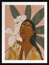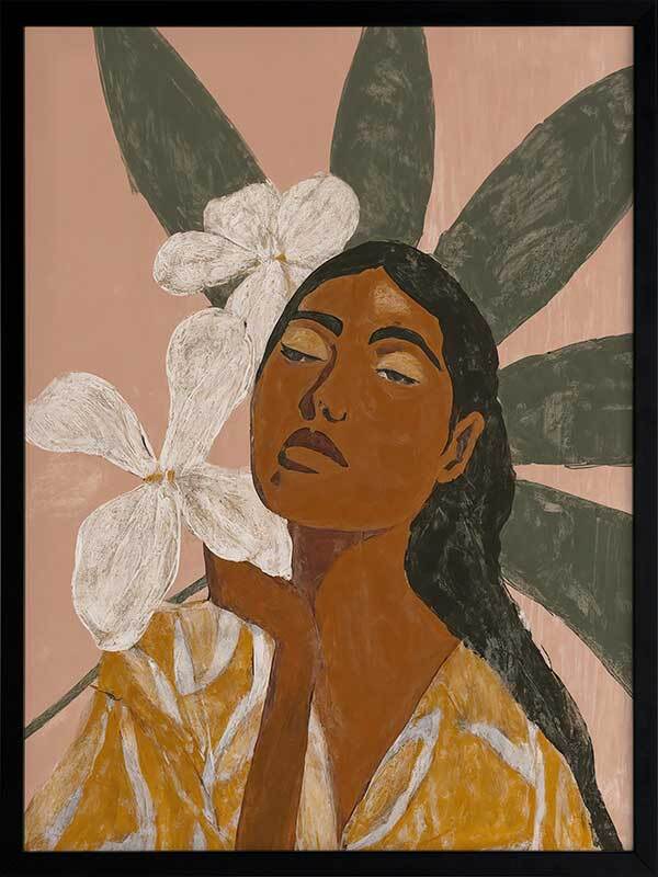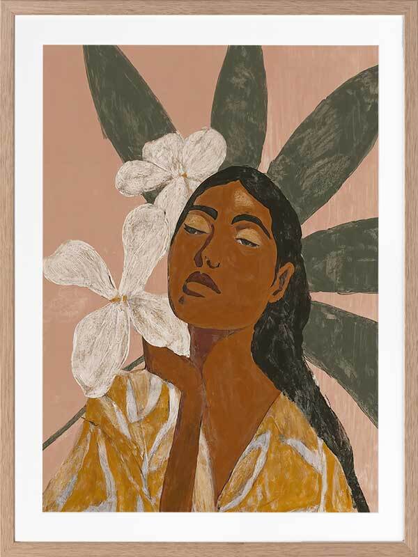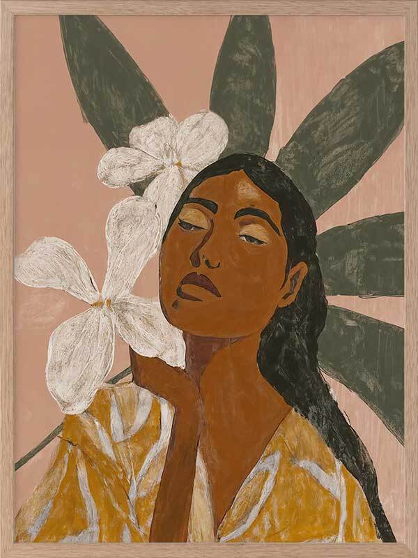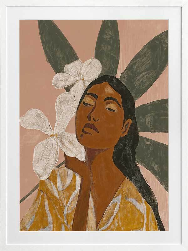 Pocah Framed Art Print - Giving total Pocahontas vibes, this Mexican-themed artwork lets you get in touch with your fearless side. Depicting a woman surrounded by beautiful white flowers, wearing a mustard yellow dress, the earthy tones of terracotta, ochre, and muted green lend to a peaceful energy.