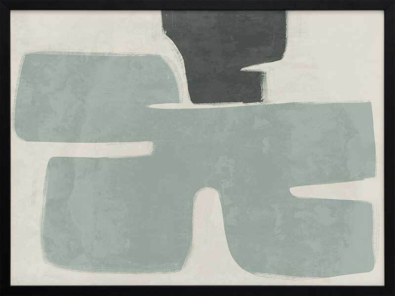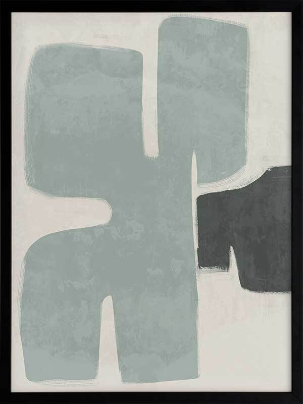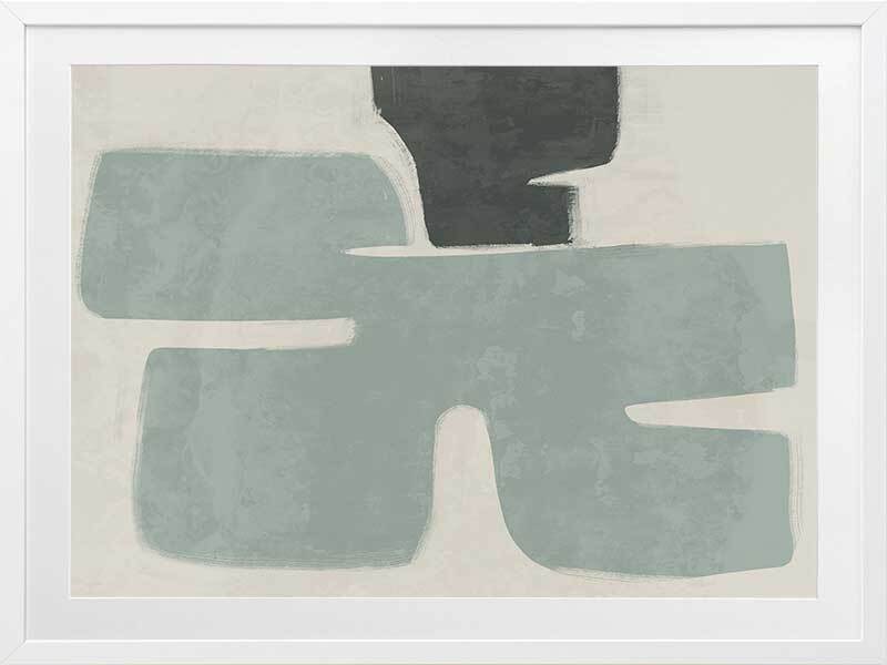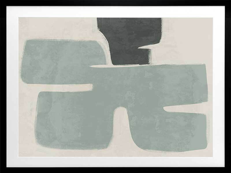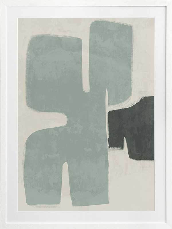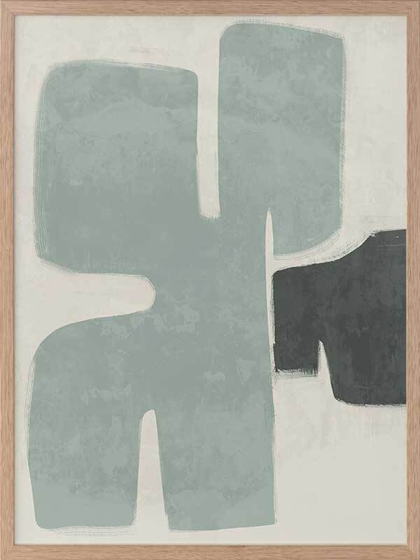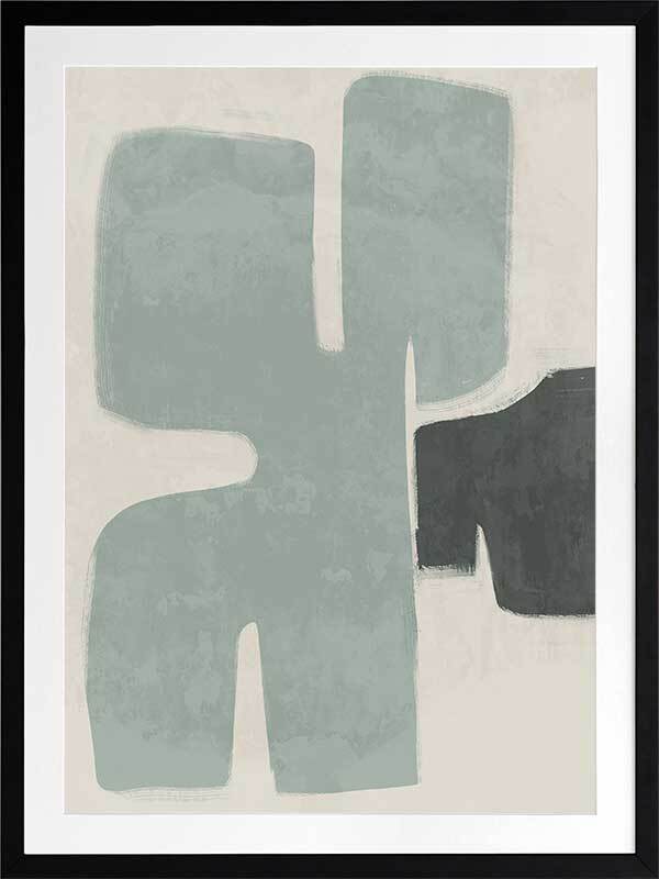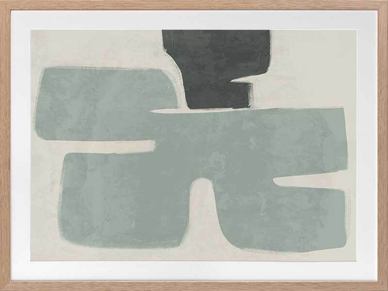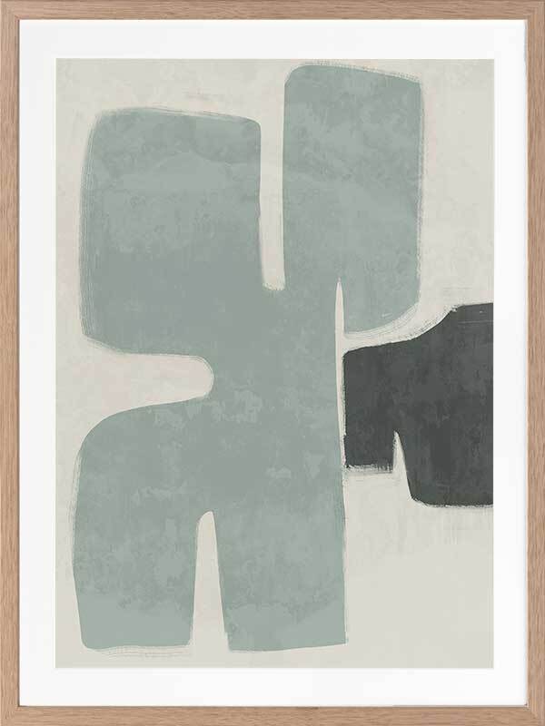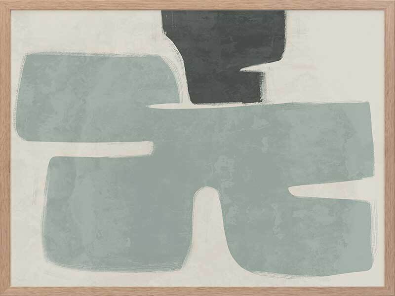 Poised Light Teal Framed Art Print - Funky, yet calm in its minimalistic approach, this abstract artwork uses rounded shapes and visible brush strokes for an organic, textured feel. A stripped-back palette of light teal, dark green, and sand means this piece suits many interior styles.