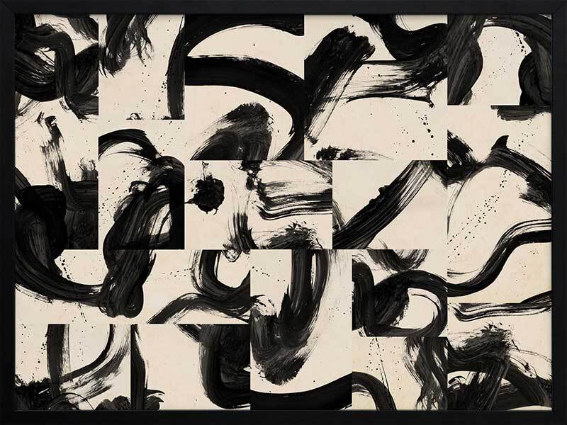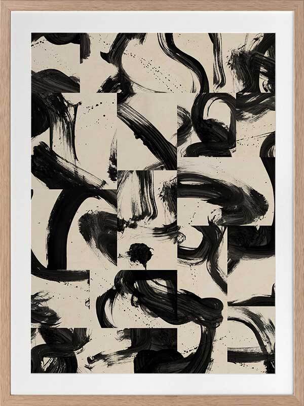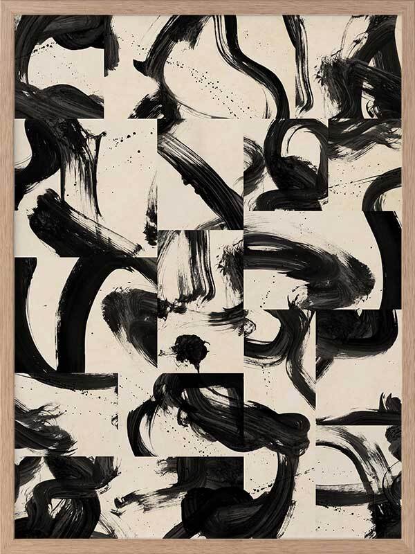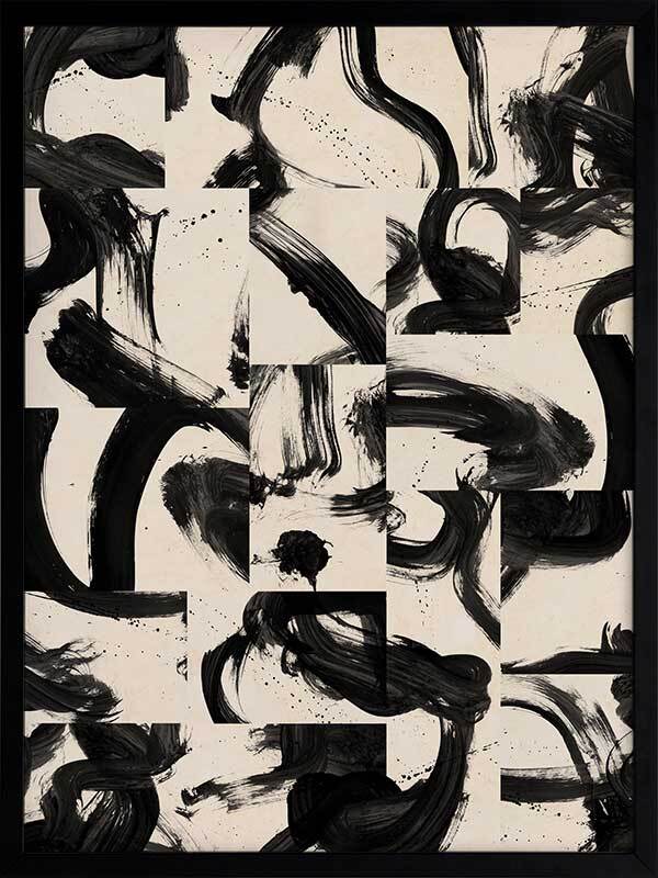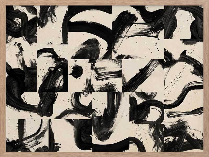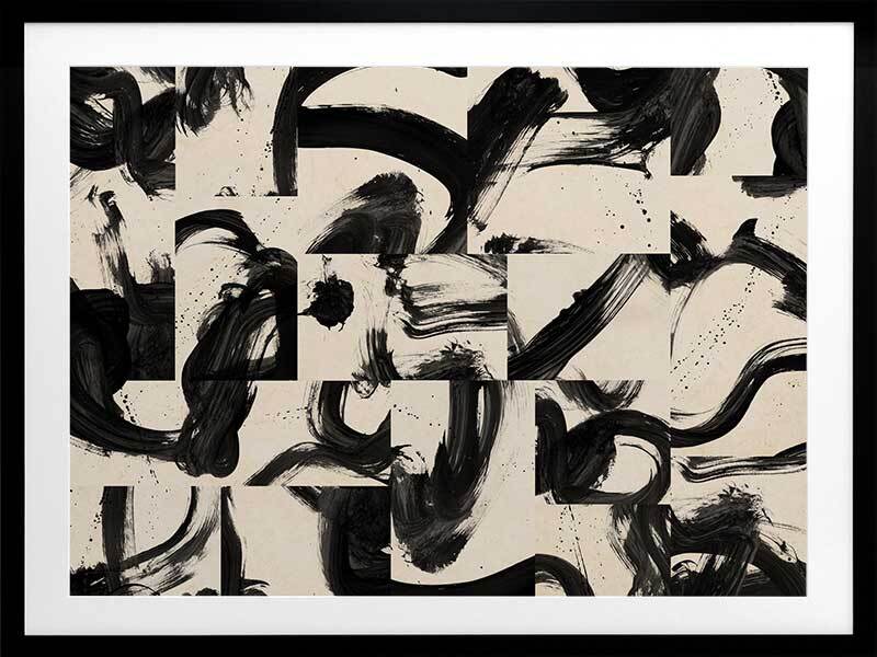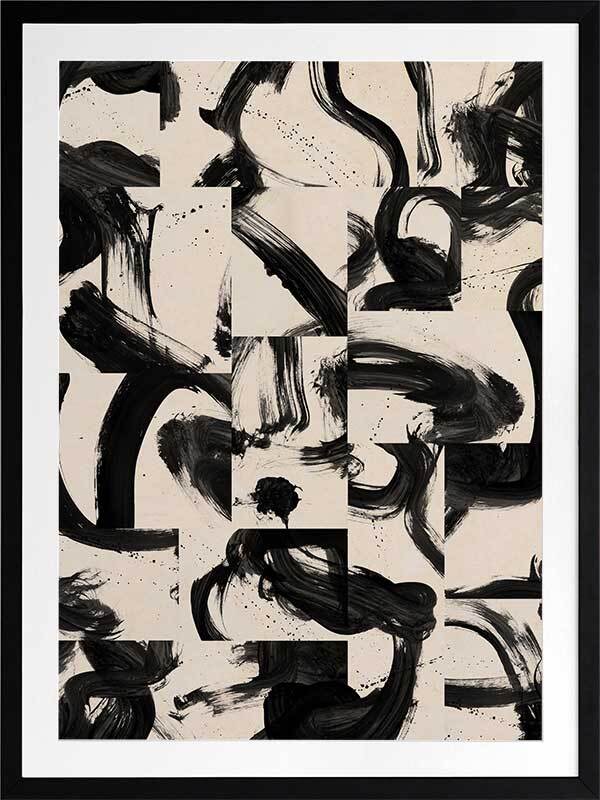 Pompeii Black Framed Print: A visually striking abstract piece that presents like a patchwork of textures and strokes. Features black watercolour on a tan background. 2020 AUTUMN/WINTER COLLECTION: REVERIE