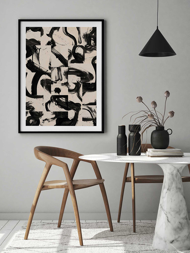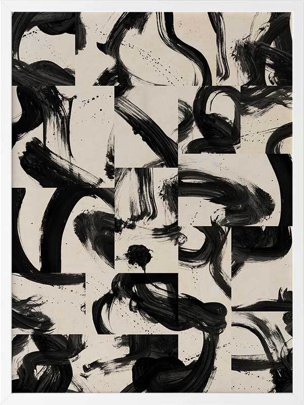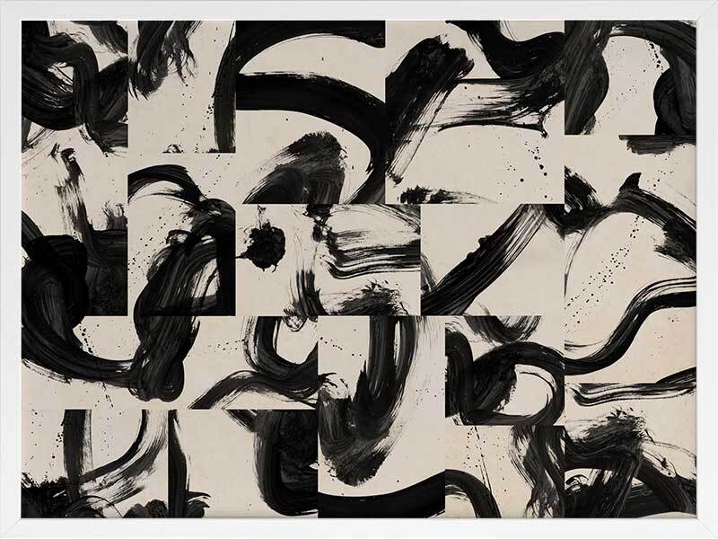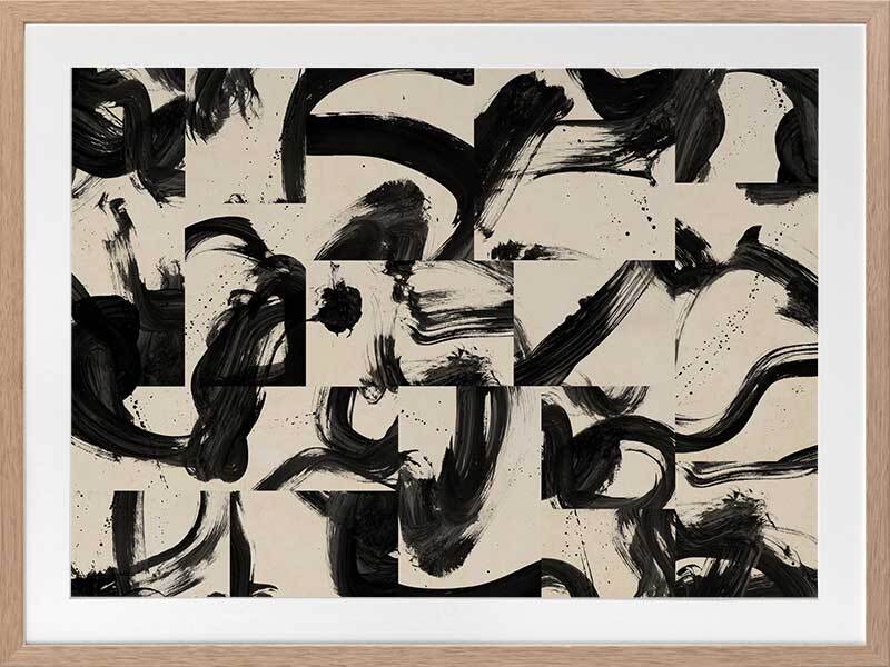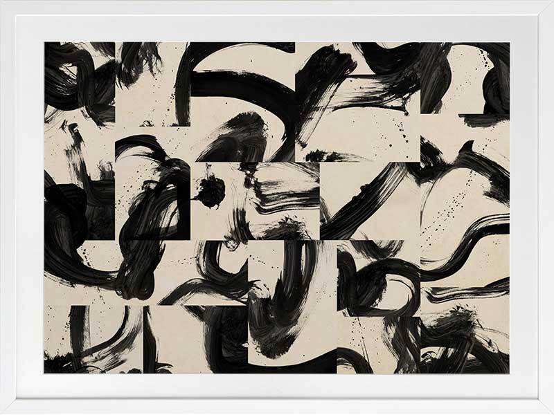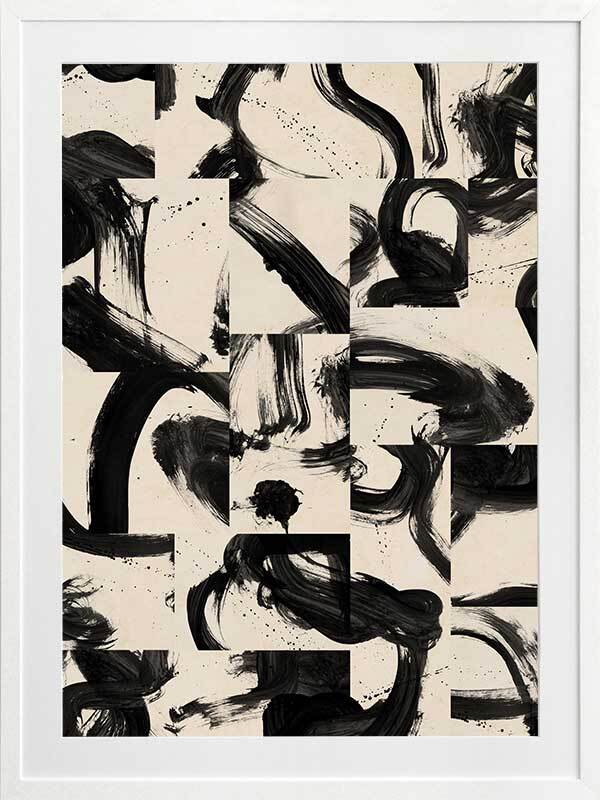 Pompeii Black Framed Print: A visually striking abstract piece that presents like a patchwork of textures and strokes. Features black watercolour on a tan background. 2020 AUTUMN/WINTER COLLECTION: REVERIE