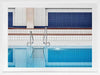 Pool Etiquette Framed Print - A cool and calming photograhic art print featuring a public pool at a quiet time of the day, devoid of the masses of people who would normally use this facility. The crisp white tiles provides balance between the deep blue shades of the water and feature tiling. The still reflection of the surroundings on the surface of the water provides an easy place for the eye to rest. THE CURATED SERIES A handpicked gallery of wall art photography that is daringly and quirky, these photographic pieces are exploding with richness of colour and texture.