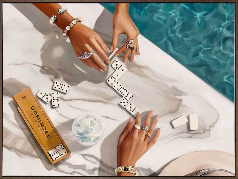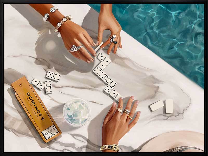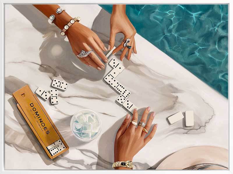 Poolside Dominoes Canvas Art Print - Two elegant, jewellery-adorned hands are mid-move in a game of dominoes on a gorgeous marble deck in this artwork from our exclusive designer art collection by Interior Designer Shaynna Blaze. The sun-soaked atmosphere, with reflections dancing off the pool, creates a luxurious, carefree summer vibe that speaks to timeless relaxation. Whether it's the subtle nod to a Palm Springs summer or the intricacy of the high-fashion details, this limited edition retro wall art adds a layer of sophistication and glamour to any space. Ideal for those looking to bring a sense of playful opulence to a living room or bedroom, this art print invites you to slow down and indulge in the finer, quieter moments of life.