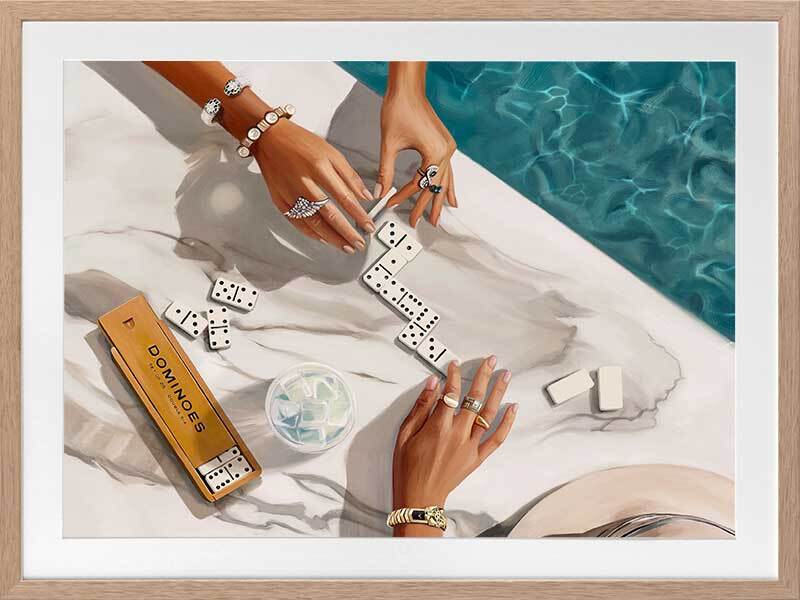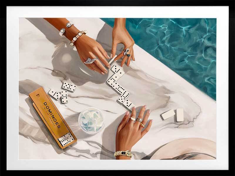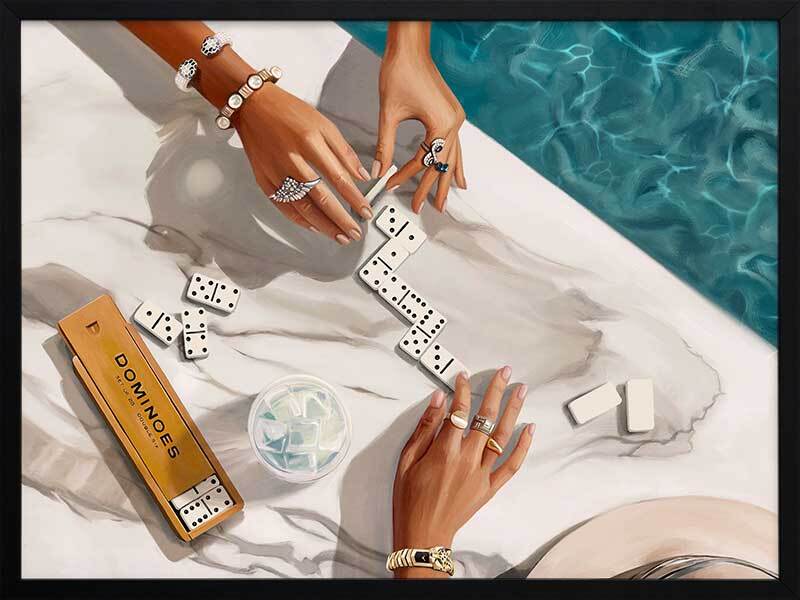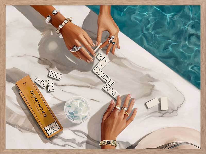 Poolside Dominoes Framed Art Print - Two elegant, jewellery-adorned hands are mid-move in a game of dominoes on a gorgeous marble deck in this artwork from our exclusive designer art collection by Interior Designer Shaynna Blaze. The sun-soaked atmosphere, with reflections dancing off the pool, creates a luxurious, carefree summer vibe that speaks to timeless relaxation. Whether it's the subtle nod to a Palm Springs summer or the intricacy of the high-fashion details, this limited edition retro wall art adds a layer of sophistication and glamour to any space. Ideal for those looking to bring a sense of playful opulence to a living room or bedroom, this art print invites you to slow down and indulge in the finer, quieter moments of life.