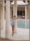 Poolside Glamour I Canvas Art Print - Bring a vintage aesthetic to your space with this beautiful photograph featuring a woman posing alongside a column in her swimsuit in front of a pool. The main colour palette is neutral featuring beiges and browns of the house and columns, contrasting against the light pastel blue of the pool. Pairs well with Poolside Glamour II & III.