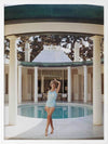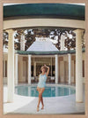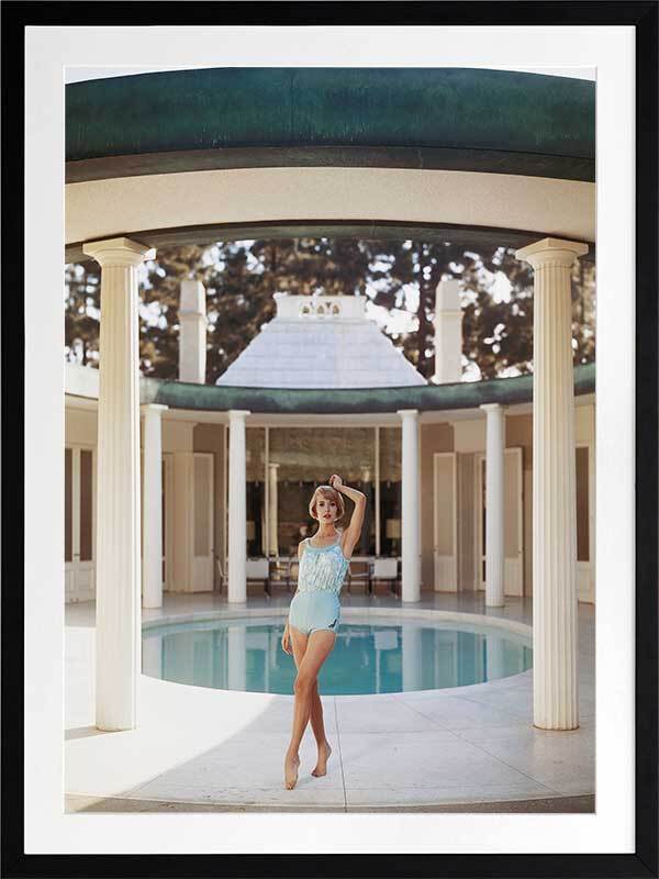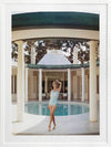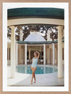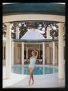 Poolside Glamour II Framed Art Print - Bring a vintage aesthetic to your space with this beautiful photograph featuring a woman posing alongside a column in her swimsuit in front of a pool. The main colour palette is neutral featuring beiges and browns of the house and columns, contrasting against the light pastel blue of the pool. Pairs well with Poolside Glamour I & III.