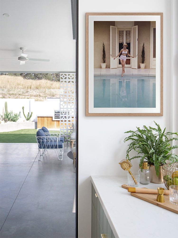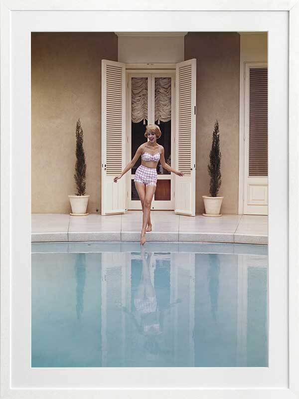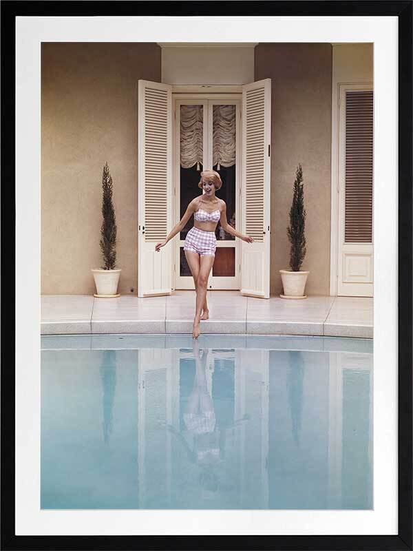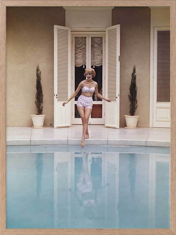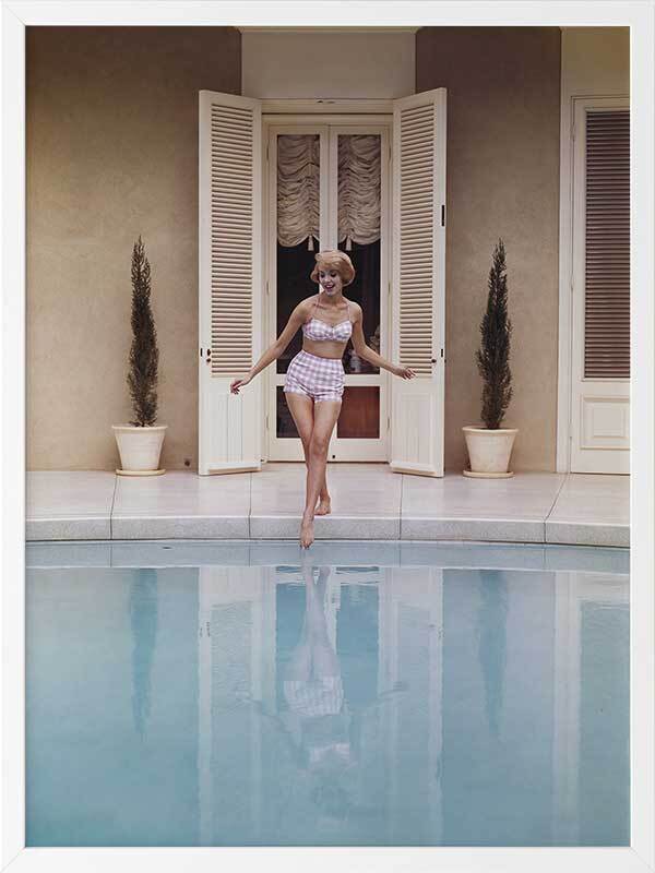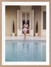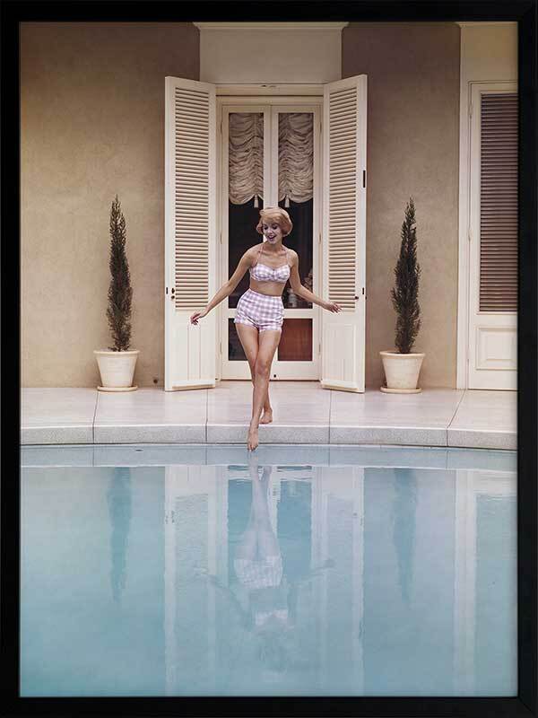 Poolside Glamour III Framed Art Print - Fancy taking a dip with this vintage photography in your home space? A woman in a vintage bathing suit playfully dips her toes into a pool. The main colour palette is neutral featuring a light pastel blue of the pool, contrasted with the brown tone of the house behind the woman. Pairs well with Poolside Glamour I and II.