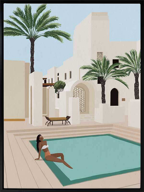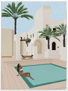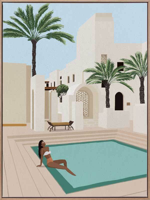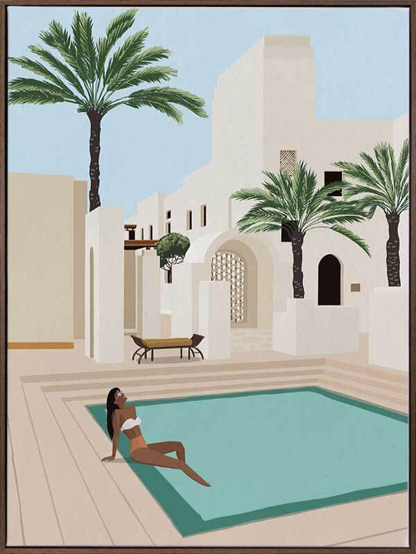 Poolside Paige Canvas Art Print - Quintessential resort style relaxation is brought to life in this peaceful yet playful illustrative piece. Featuring a beautiful poolside sunbather against a backdrop of stunning, Moroccan-inspired architecture, the colour palette is light and bright. Cream and beige buildings contrast beautifully with bright pops of blue and green from the sky, pool and palm trees.