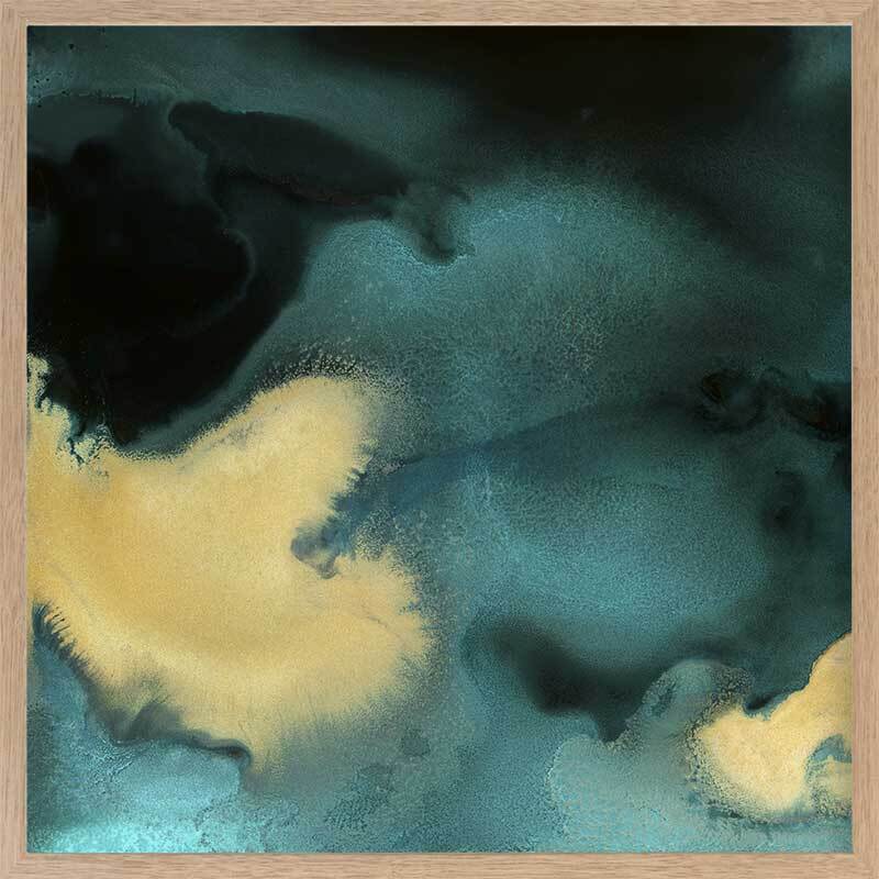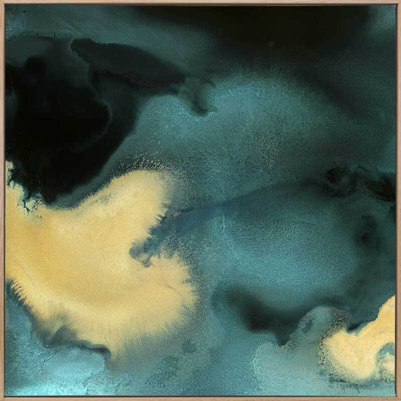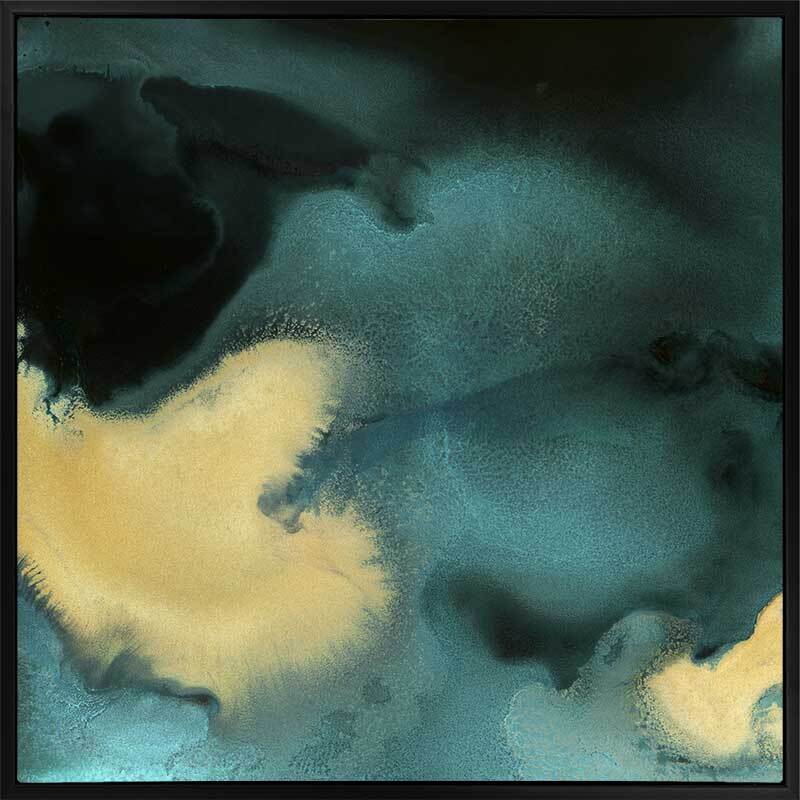 Poseidon II Canvas Art Print: An abstract artwork featuring a beautiful marbling of teal and black with a contrasting ribbon of golden yellow running through it. Pairs with Poseidon I. 2019 AUTUMN/WINTER COLLECTION: ODYSSEY