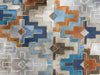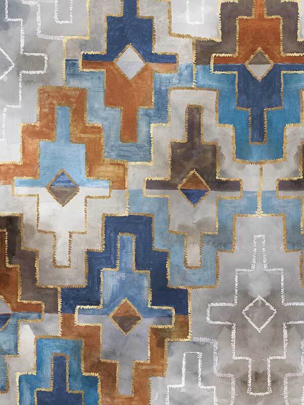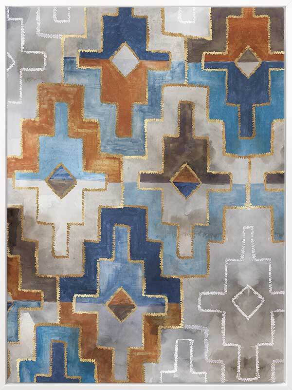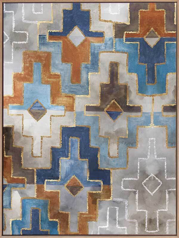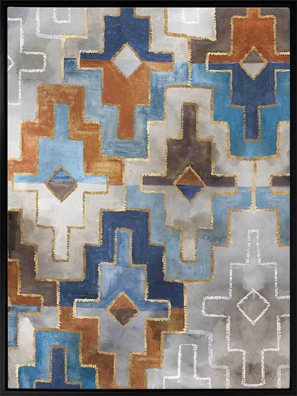 Positive I Canvas Art Print - Inspired by intricate detailing on Persian rug designs, this piece makes a statement with structured, clean lines and bold colours of blue, warm brown, and soft grey with glistening gold linework. With some unfinished work in either corner, this piece celebrates the beauty in bareness, giving a more relaxed feel to your space.