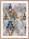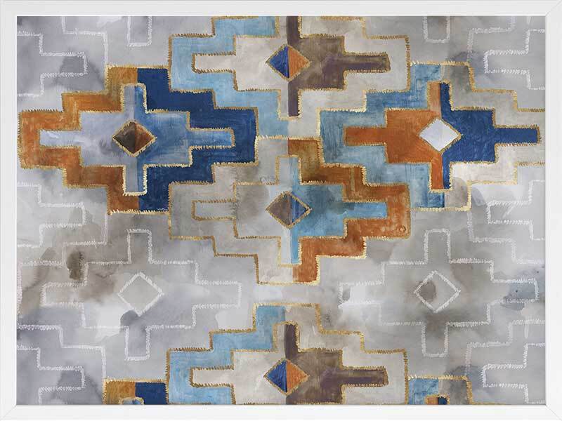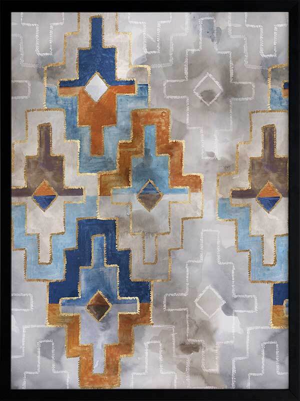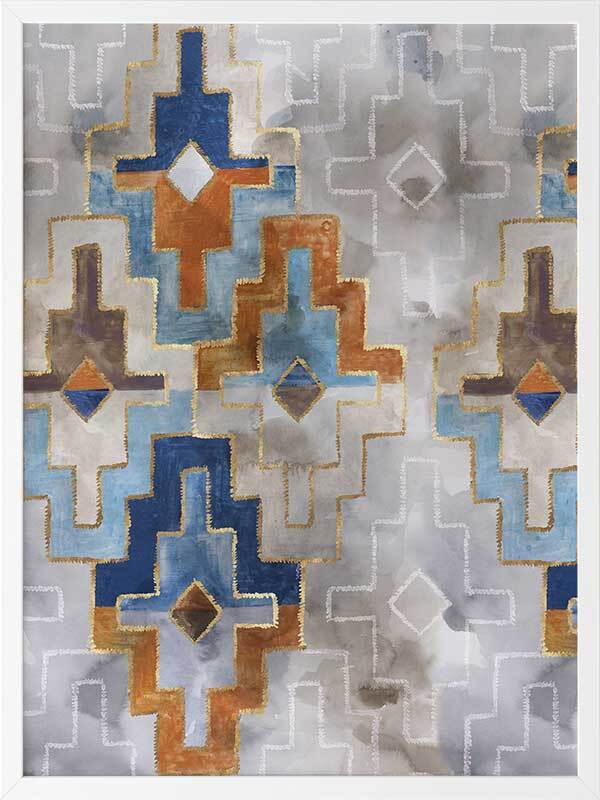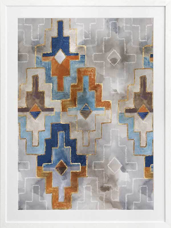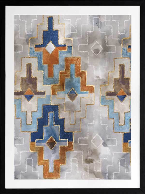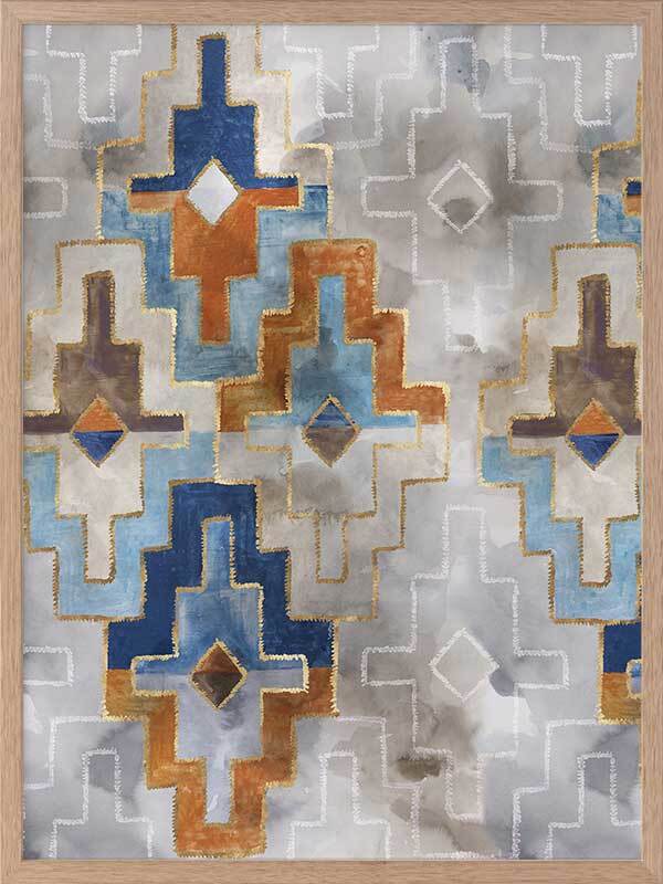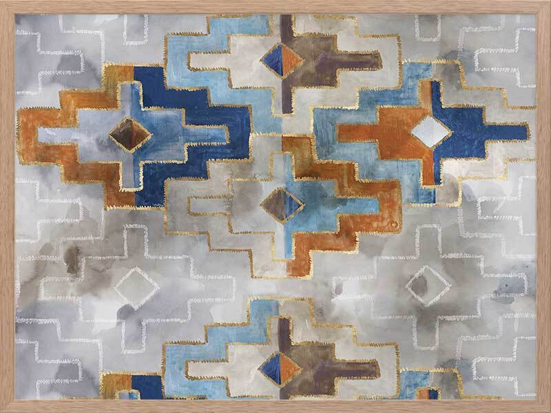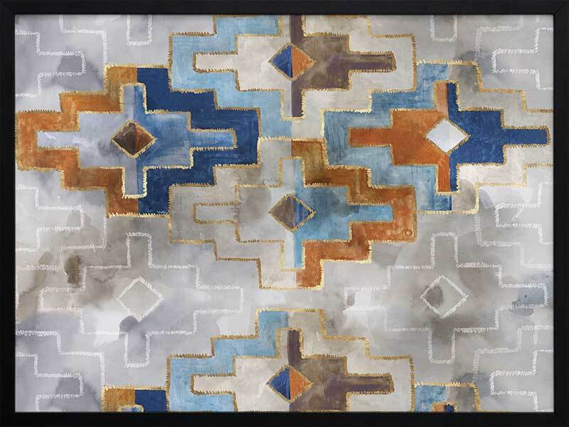 Positive II Framed Art Print - Inspired by intricate detailing on Persian rug designs, this piece makes a statement with structured, clean lines and bold colours of blue, warm brown, and soft grey with glistening gold linework. With some unfinished work in either corner, this piece celebrates the beauty in bareness, giving a more relaxed feel to your space.