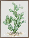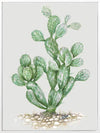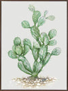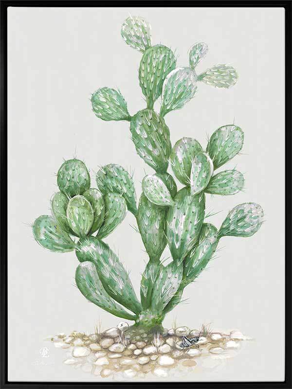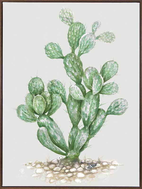 Prickly Pear Canvas Art Print - An accurate still life of Chile's wild prickly pears, covered in spikes and virtually untouchable by the human hand. A species of flat-stemmed cacti, each prickly pair has a sculptural look and feel, appearing as living sculptures from afar, but in fact a haven for bees and insects of all shapes and colours when taking a much closer look. With its simple colour palette featuring rich green and several beige tones, this artwork incorporates well with many interior design styles.