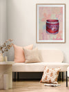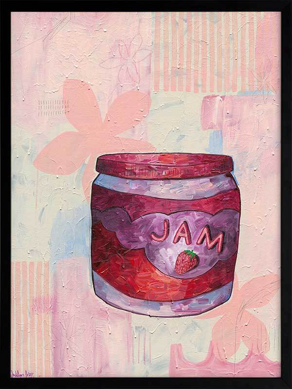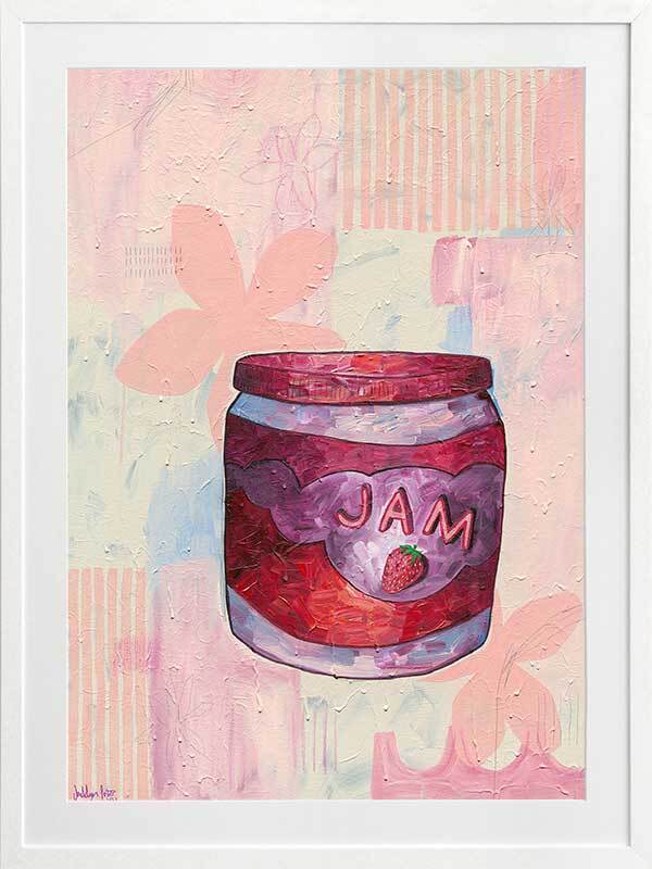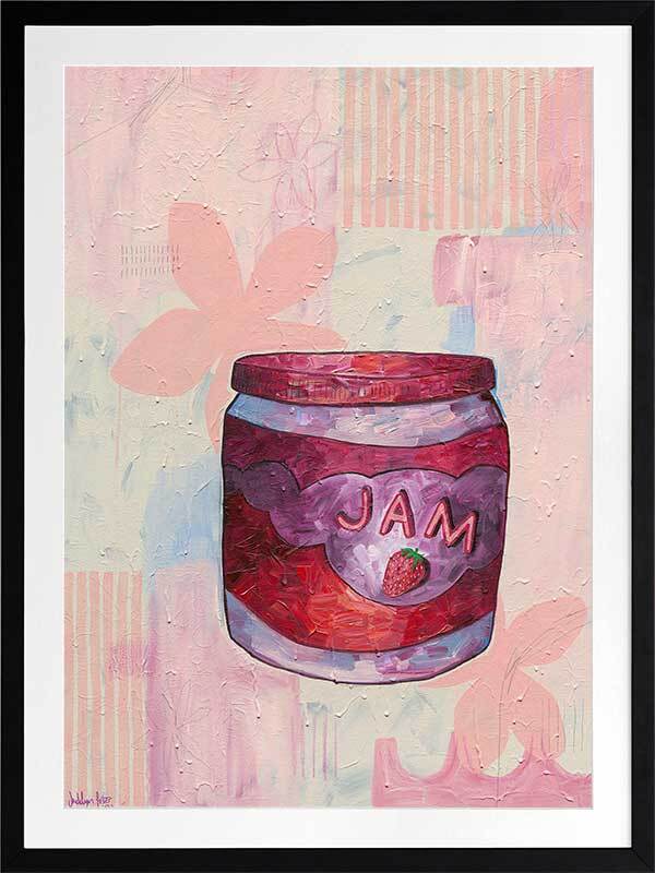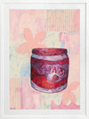 Pump Up The Jam Pink Framed Art Print - According to Urban Dictionary, "Pump Up The Jam" means "to set the dancefloor on fire". Perhaps the only dancefloor we've been burning up lately is our kitchen floor, but either way, this piece is a friendly reminder of all that brings us joy in life, with its sweet pink, pale blue and yellow palette, paired with soft graphic imagery using abstract lines and shapes. Now pop open that jar and spread some strawberry sweetness on toast to share with family and friends on a late Sunday morning.