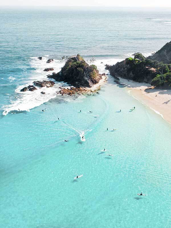 Pura Vida Canvas Art Print - Every surfer's dream - this breathtaking aerial photographic art print depicts crystal clear waters beside a beach, with rocks and trees among surfers waiting for their waves. Palette includes bright teal shades, neutrals, and dark greens, adding to the dreamy coastal vibes.
