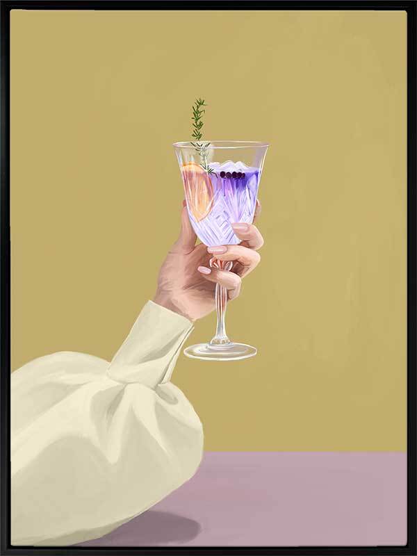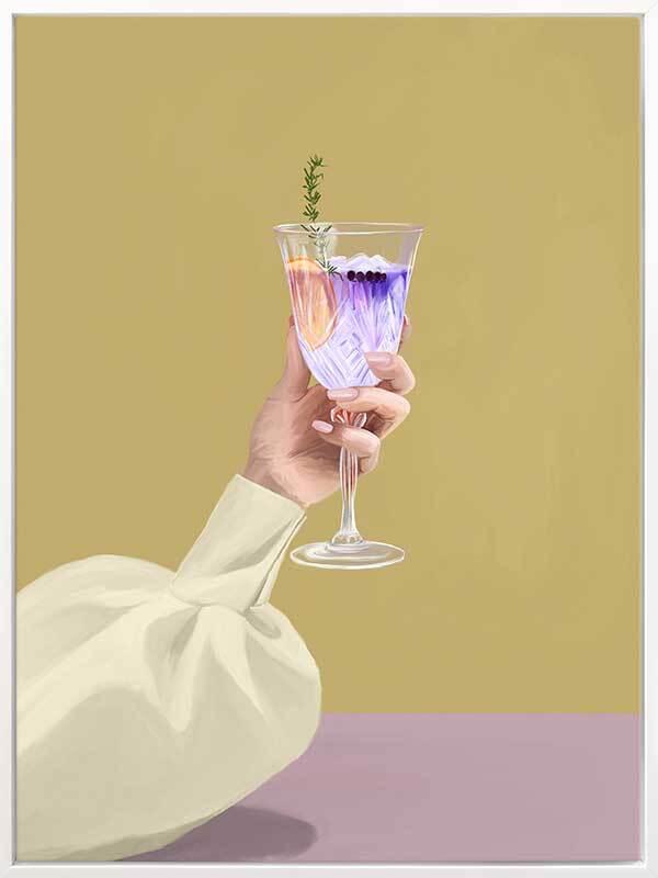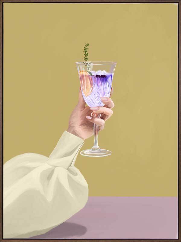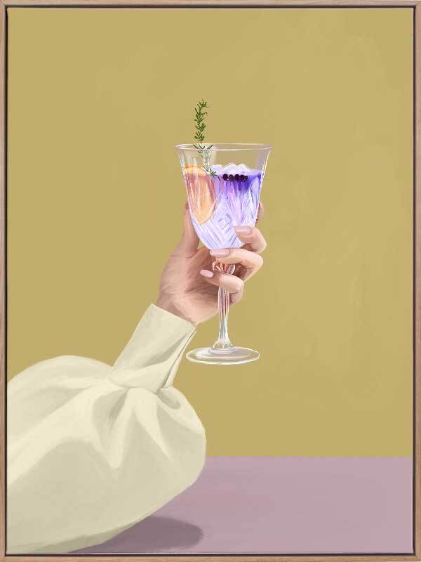 Purple Ink Gin Canvas Art Print - Raise a glass for those special moments, with a splash of fresh fruit and fragrant flowers to really set the scene. This gorgeous modern art print brings a joyful, yet sophisticated energy to your space with a woman making a toast with a crystal glass of purple Ink Gin just as stylish as her, billowing puffy sleeve and all. A palette of deep yellow, lilac, and soft beige tones makes bright purple, orange and green shades pop, making this artwork versatile for any home.