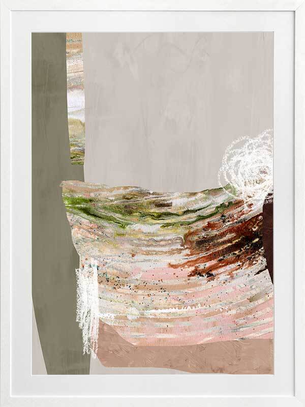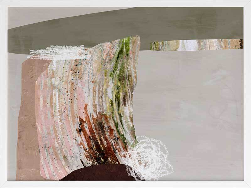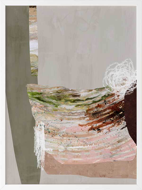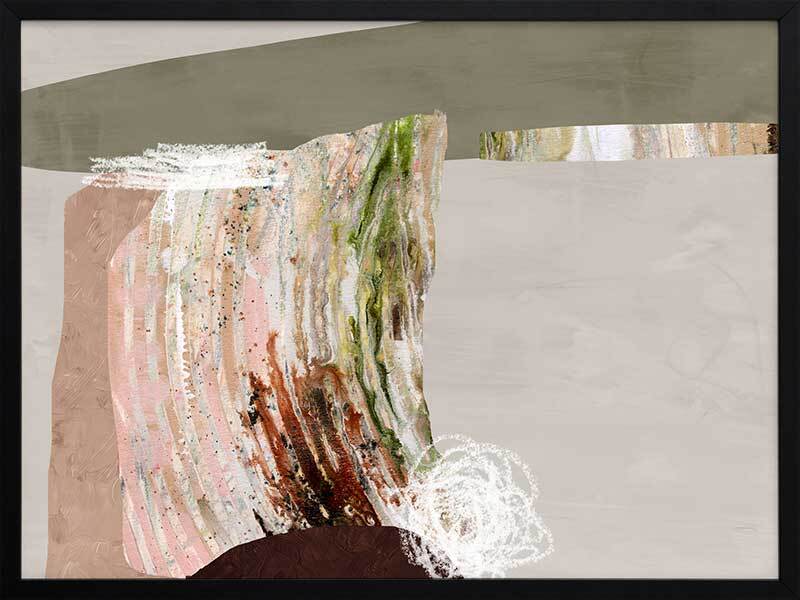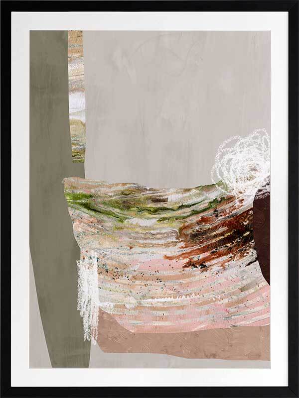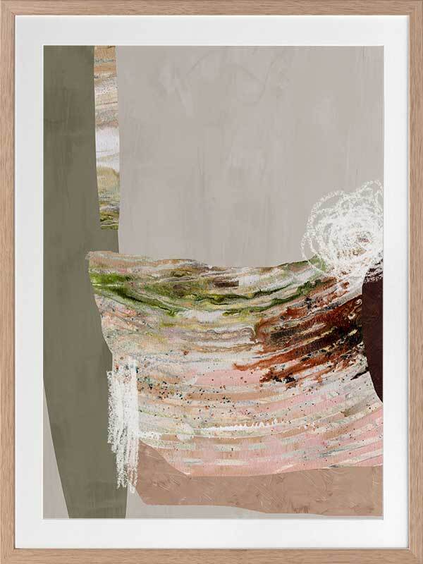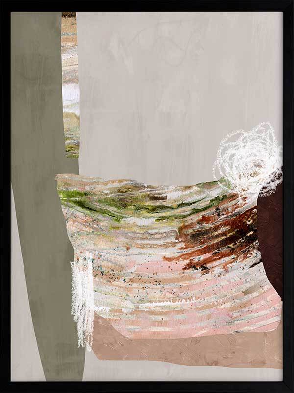 Quantum I Framed Print: A bold, textured abstract artwork featuring a blend of pink, nude, burgundy and green. Pairs with Quantum II. 2020 AUTUMN/WINTER COLLECTION: REVERIE