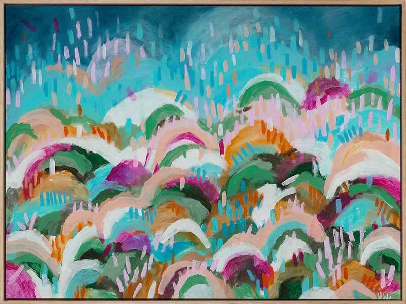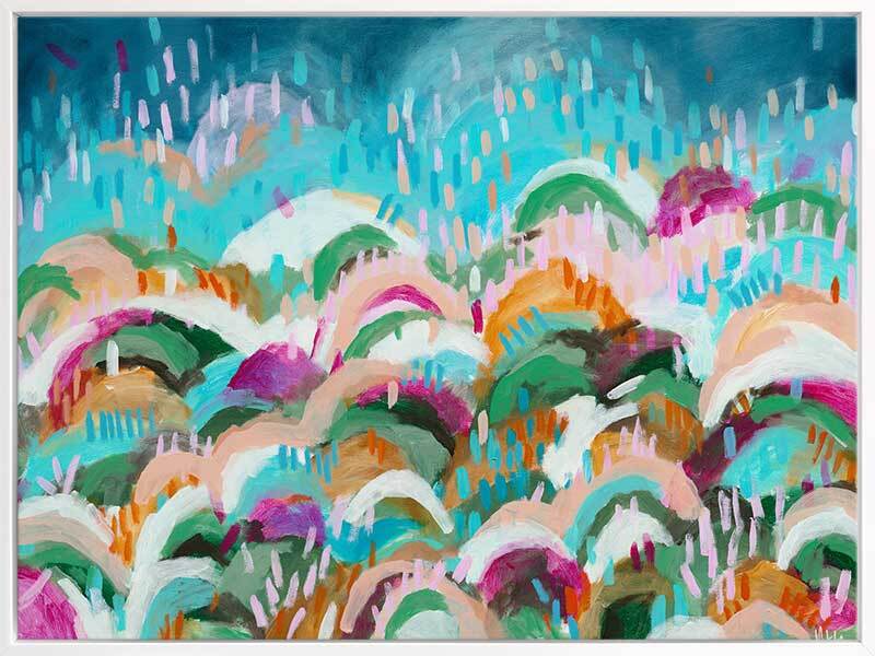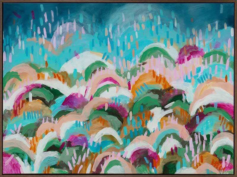 Rainbow Hills Canvas Art Print - This artwork is inspired by that little road that no-one else knows about - the place where you can let yourself go, and become one with nature. This dreamy landscape features painterly brush strokes, line work and beautiful layers in a richly vibrant colour palette of aqua, blue, fuschia pink, and orange.