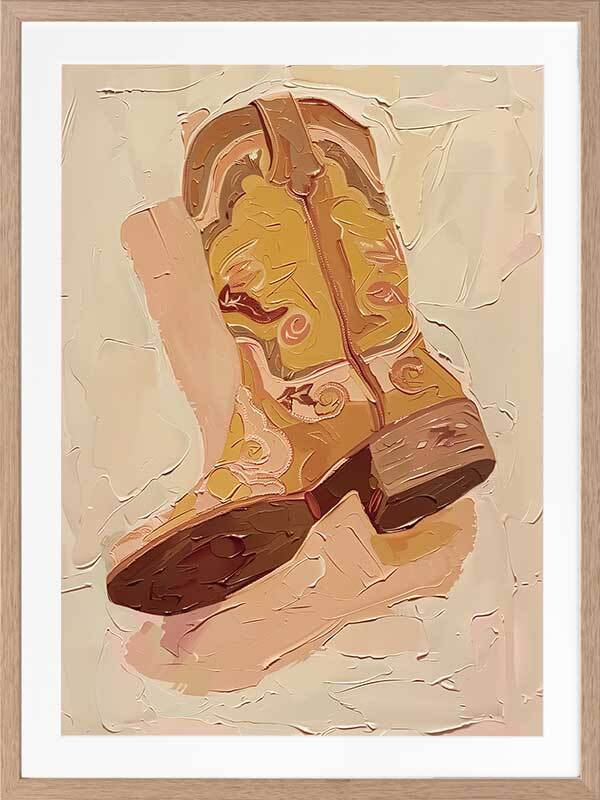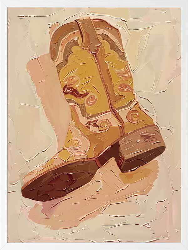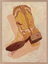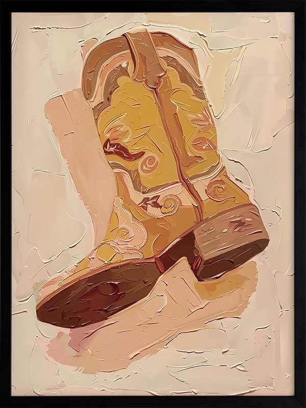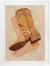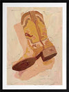 Ranch Boots Framed Art Print - The artwork features a single, well-worn cowboy boot, its design evoking the rustic charm of the American Wild West. Textured paint create a warm and impressionistic look, with a palette that swirls together tawny browns, creams, and hints of gold.
