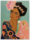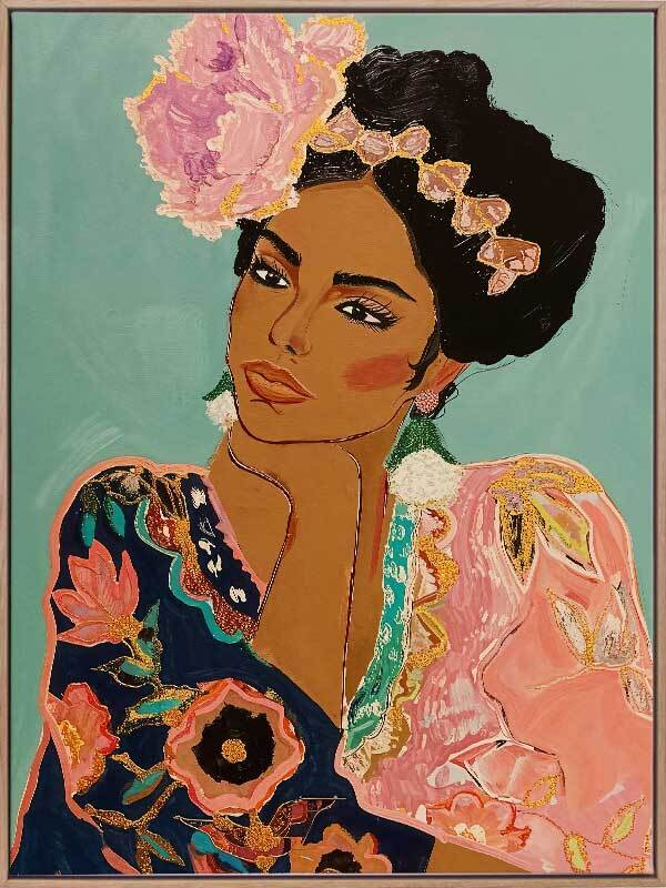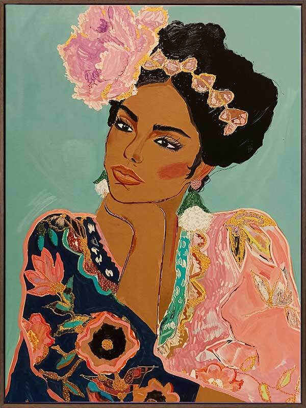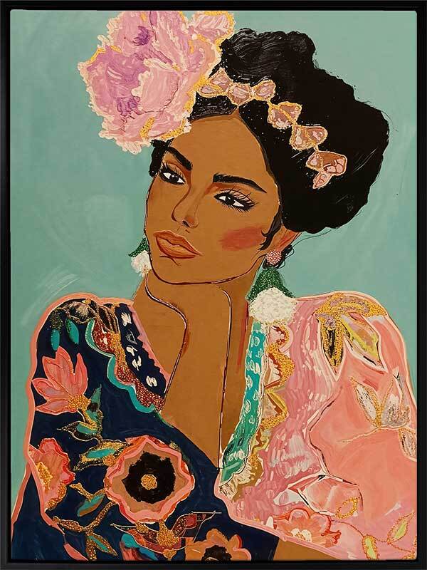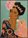 Rebel Rosa Canvas Art Print - Be wild, be a rebel like Rosa. This breathtaking portrait artwork features Rosa dressed in a traditional Mexican dress, adorned in elaborate patterns, outlines of gold sparkling all over. Playful yet contemplative, this piece uses a palette of pink, blue, purple, brown, and blue shades.