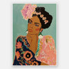 Rebel Rosa Unframed Art Print - Be wild, be a rebel like Rosa. This breathtaking portrait artwork features Rosa dressed in a traditional Mexican dress, adorned in elaborate patterns, outlines of gold sparkling all over. Playful yet contemplative, this piece uses a palette of pink, blue, purple, brown, and blue shades.