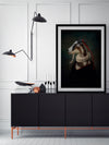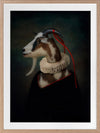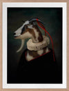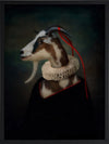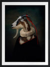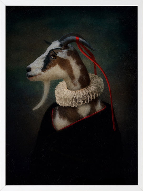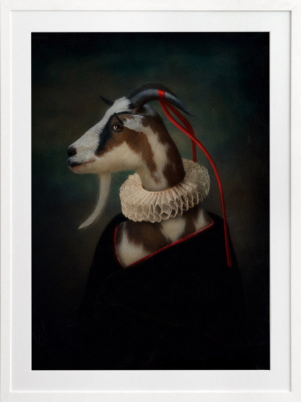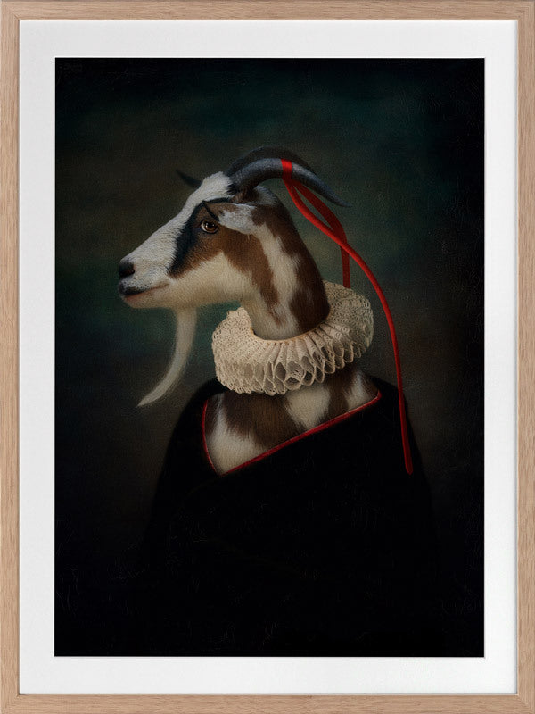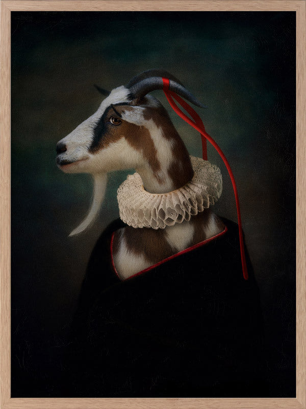 Renaissance Goat Framed Art Print - A quirky, portrait-style artwork featuring a goat with a ruff collar. THE CURATED SERIES A handpicked gallery of daringly quirky photographic pieces exploding with richness of colour and texture.