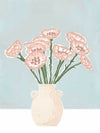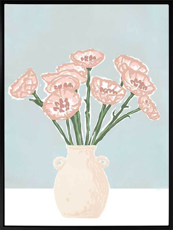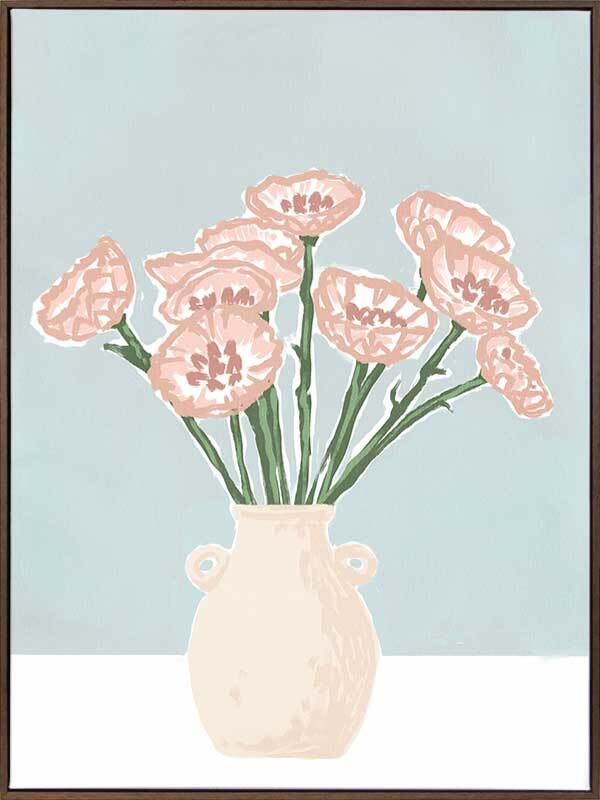 Renewed II Canvas Art Print - There's nothing quite like the feeling of receiving a fresh bouquet, the sweet flowery scents filling the air, a renewed energy brought to your space. Featuring our tall Reed Ceramic Vessel holding a bursting armful of flowers. A soft, muted palette of sky blue, white, cream, orange-toned pink, and green evoke a dreamy essence.