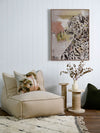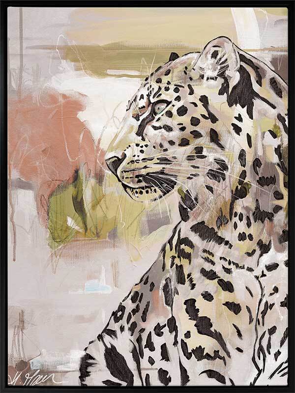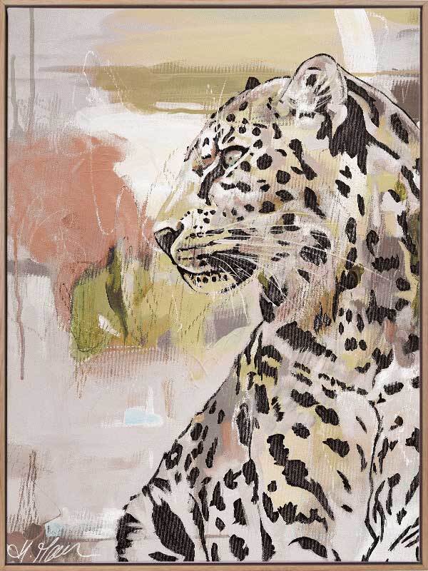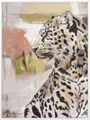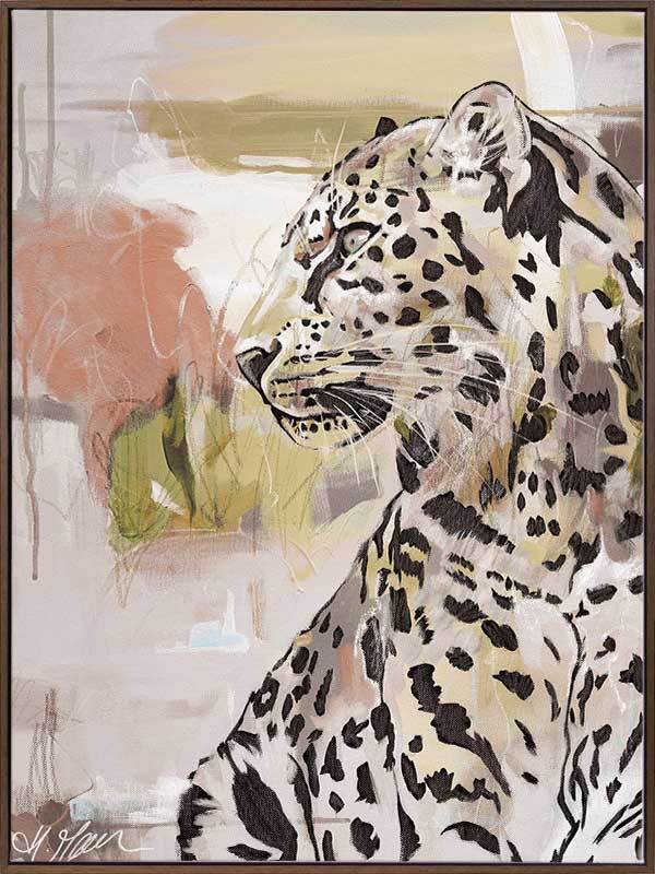 Resurrected Romance Khaki Canvas Art Print - A proud leopard sits patiently , peering eagerly into the horizon, waiting for its next move. Muted khaki tones blend with a warm, burnt orange shade and grey background to reflect its pensive nature, with uneven brush strokes and dripping paint for an added abstract effect.