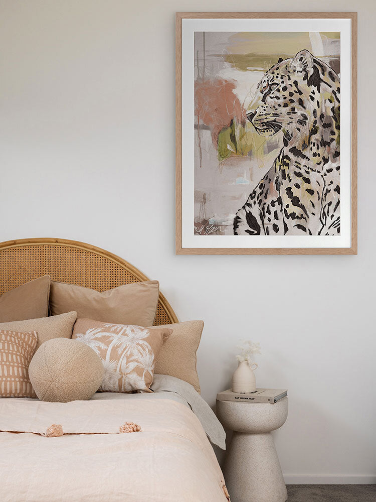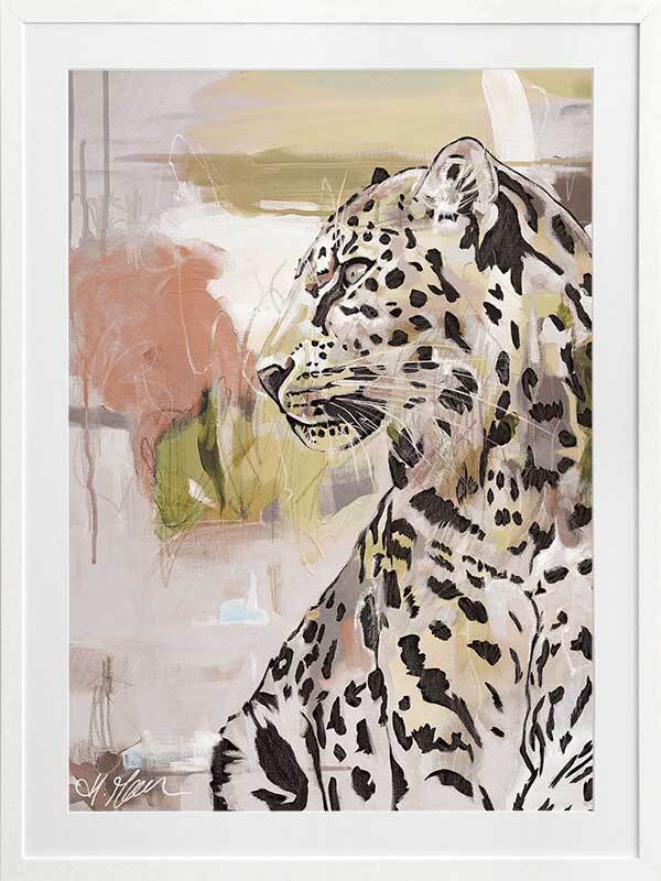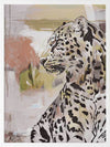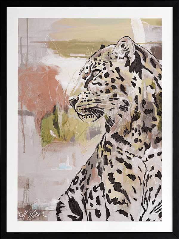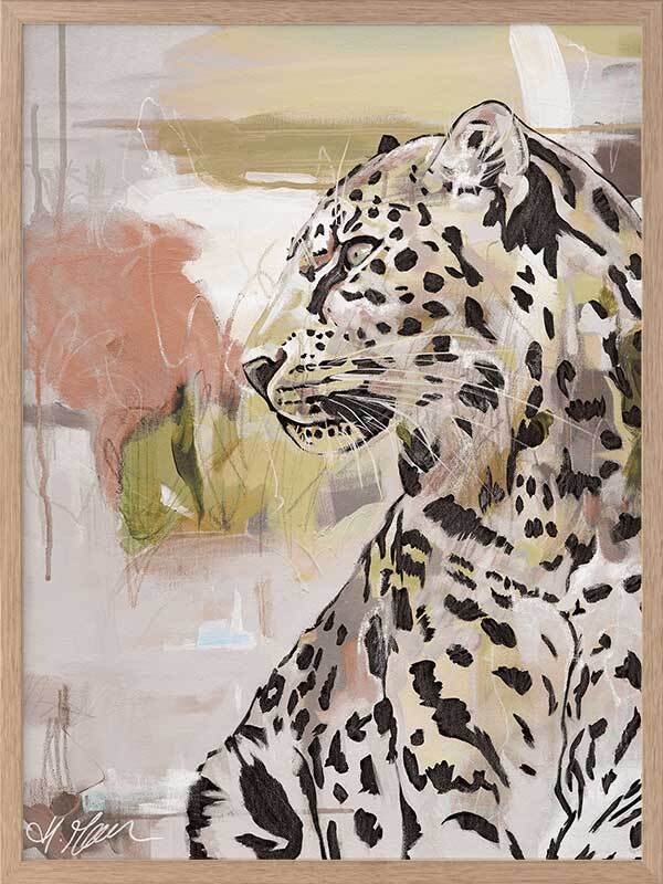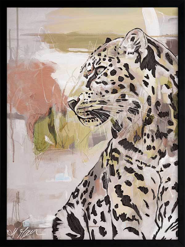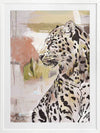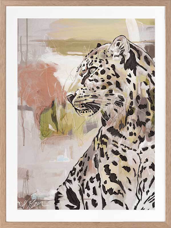 Resurrected Romance Khaki Framed Art Print - A proud leopard sits patiently , peering eagerly into the horizon, waiting for its next move. Muted khaki tones blend with a warm, burnt orange shade and grey background to reflect its pensive nature, with uneven brush strokes and dripping paint for an added abstract effect.