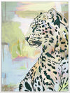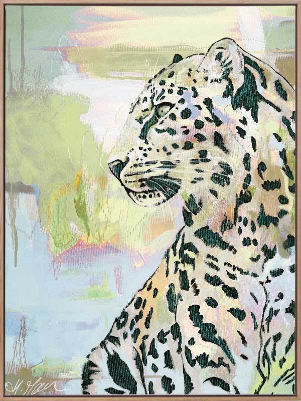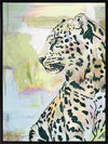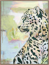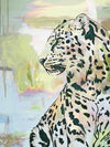 Resurrected Romance Pastel Canvas Art Print - A proud leopard sits patiently , peering eagerly into the horizon, waiting for its next move. Pastel yellow, green, and purple tones blend with a pale blue background to reflect its pensive nature, with uneven brush strokes and dripping paint for an added abstract effect.