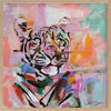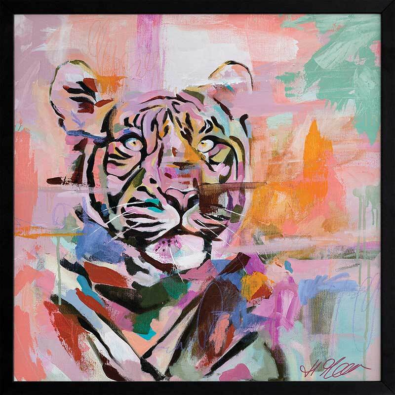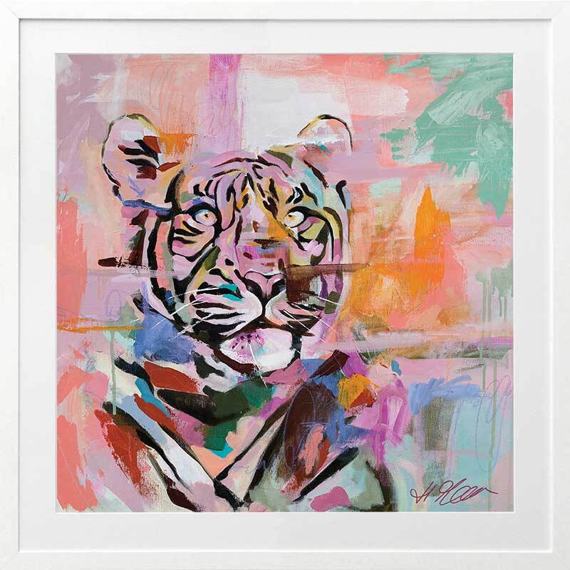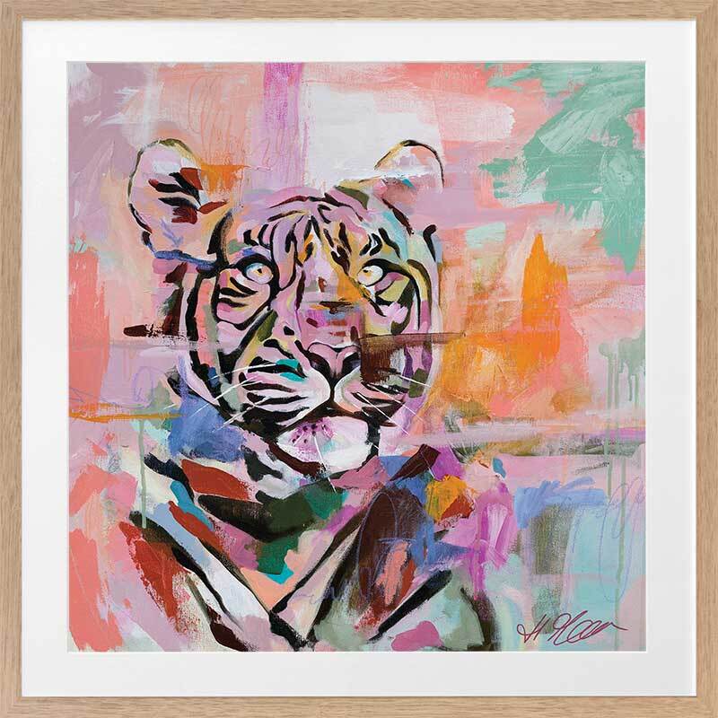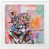 Retrospect Pink Framed Art Print - A true statement piece, this artwork brings a powerful energy to any space. Featuring a gazing tiger, standing tall, preparing its next move, a captivating palette of bright pinks tones, with splashes of orange, green, red and blue, make his the perfect piece to inject some fun colour into your space among neutral tones.