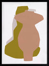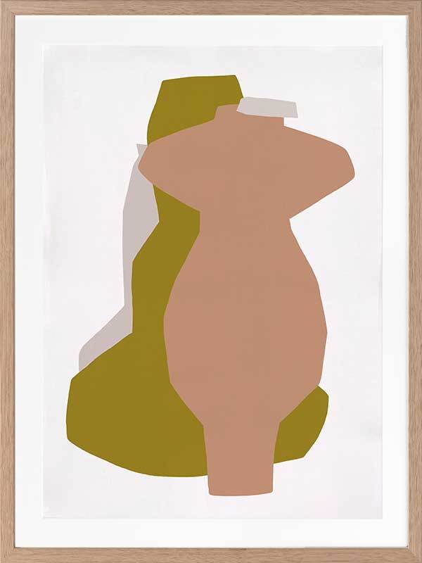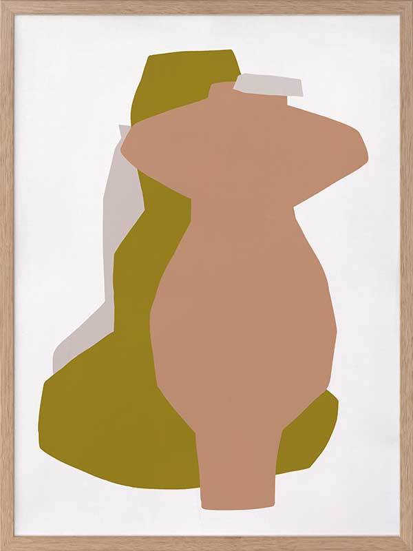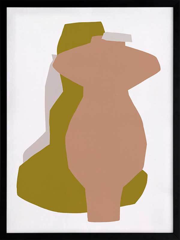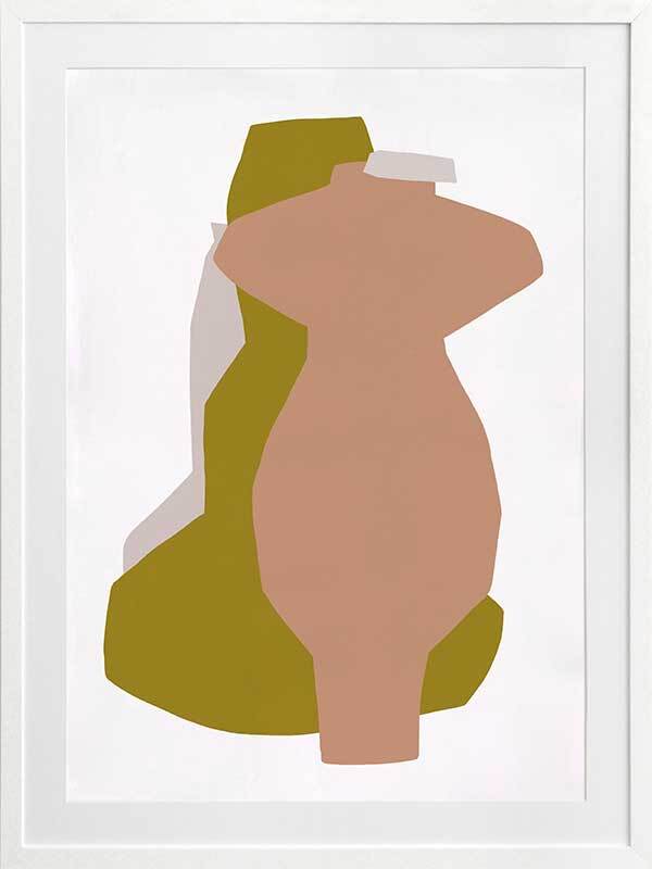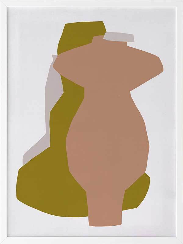 Riad I Framed Art Print - An abstract take on shadowy forms, this piece portrays a silhouette view of three standing vessels, each as unique as the next. Using flat, warm colours of peach pink, golden-toned yellow, and pale grey against a white background, the simplicity of this piece blends beautifully with any interior design style. Like the myriad of textures you'll find among handmade pieces along the market streets of Marrakech, this artwork features a texturized look to enhance that rustic feel.